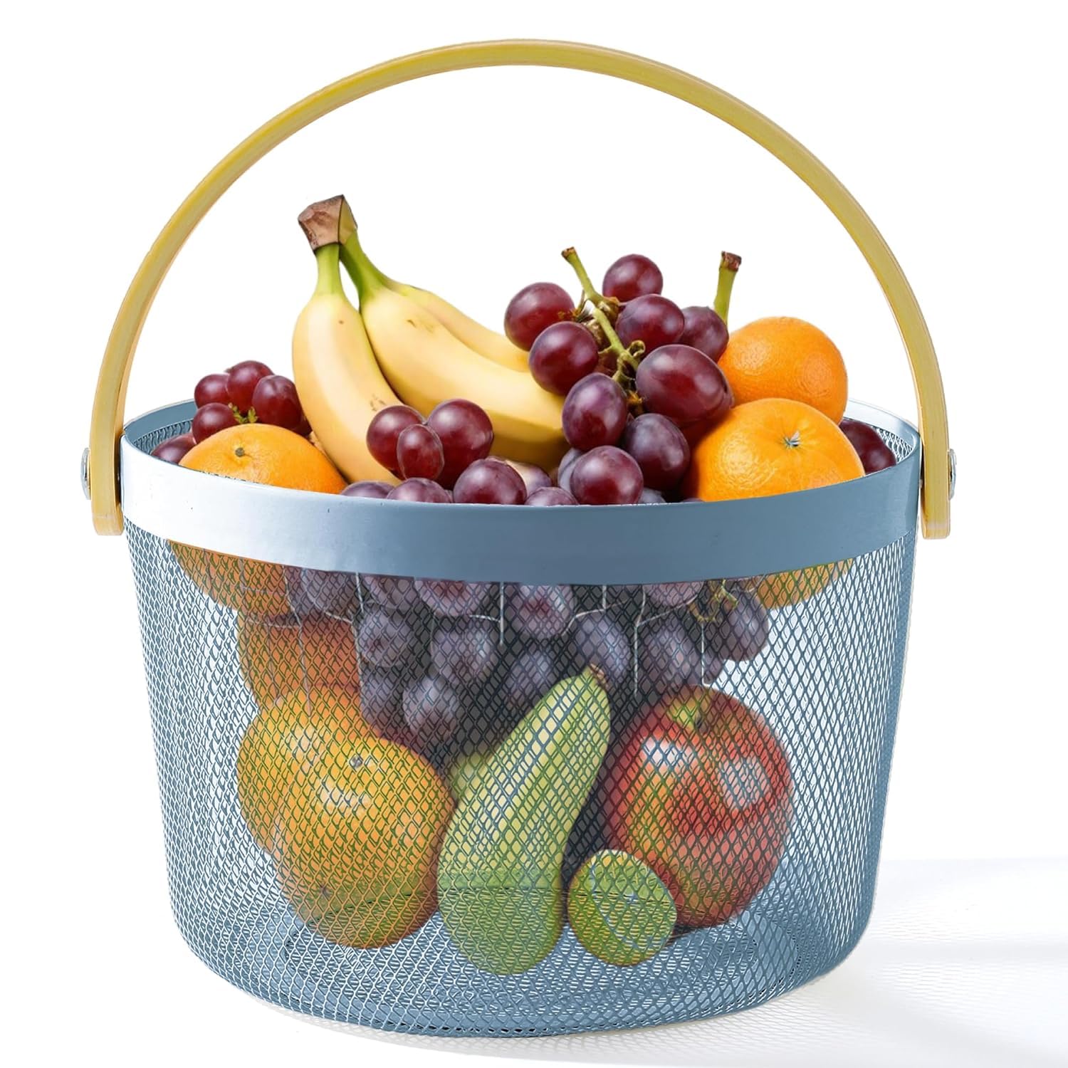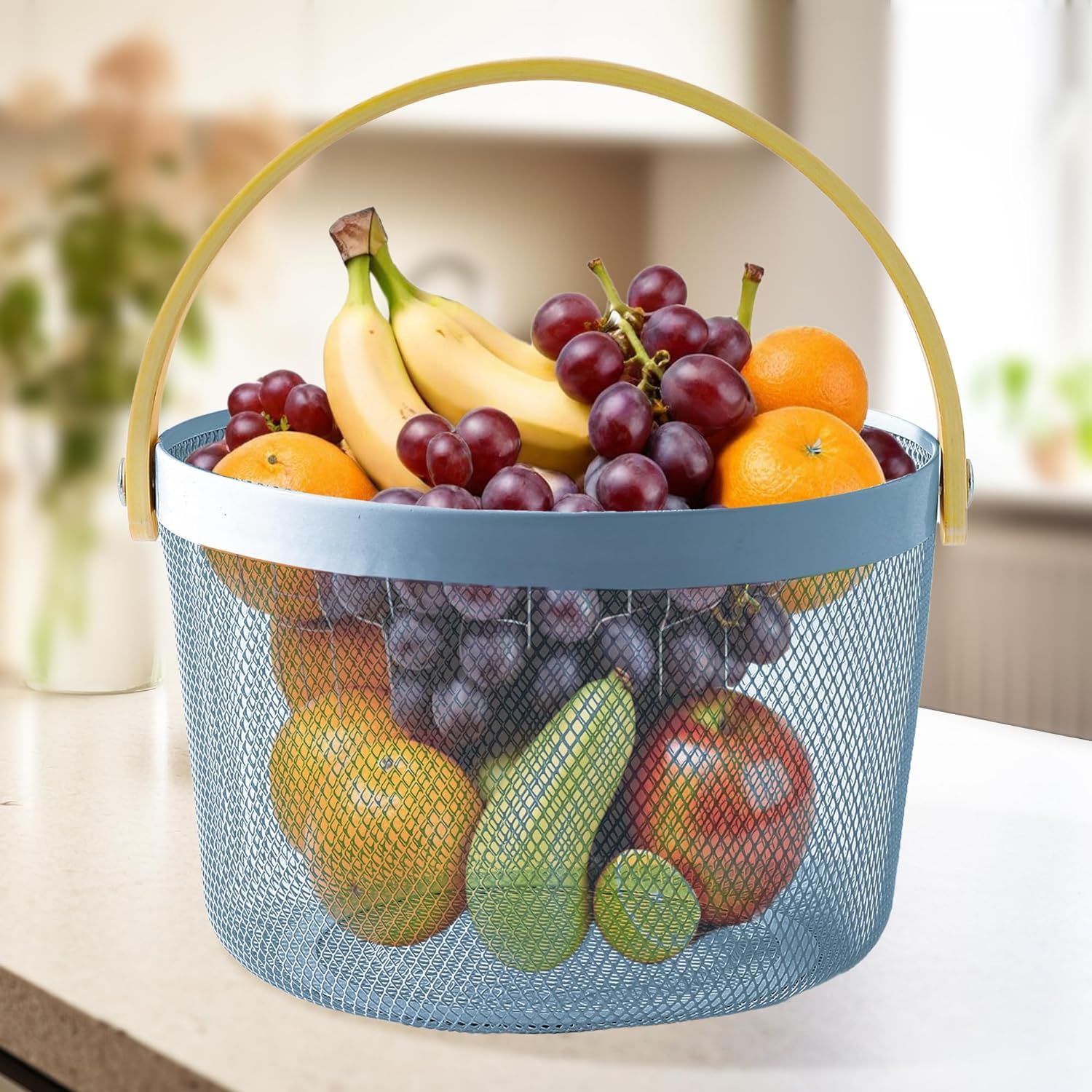 Introducing the Kuber Industries Basket for Storage, a versatile and stylish addition as your baskets for organizing home and kitchen organizer needs. This metal mesh wire basket comes with a sturdy wooden handle, ensuring easy handling and longevity. The anti-rust surface adds durability, while the fast drainage feature keeps your items dry and fresh. The beautiful blue color adds a pop of color to your space, making it both functional and aesthetically pleasing. With a round shape and stable base, this basket offers a large capacity and wider space for all your storage needs. The breathable design allows for proper ventilation, while the easy-to-clean surface ensures maintenance is a breeze. Whether you need to store fruits and vegetables, clothes, toiletries, or household items, this multipurpose basket has you covered. Perfect for organizing your pantry, classroom, living room, or even for picnics and shopping trips, this basket is designed to meet your everyday needs. The wooden handle provides a comfortable grip, making it suitable for kids, daughters, and mothers alike. Use it in the kitchen, cupboard, or bathroom for convenient storage solutions. With the Kuber Industries Basket, you can enjoy a reliable brand, convenient design, and good quality at a value-for-money price. The lightweight and sturdy construction ensure your items are secure while offering easy mobility. The presentable packaging makes it a great gift option for your loved ones. Upgrade your storage game with the Kuber Industries Basket for Storage. Get organized in style and convenience today!Detailed Specifications: