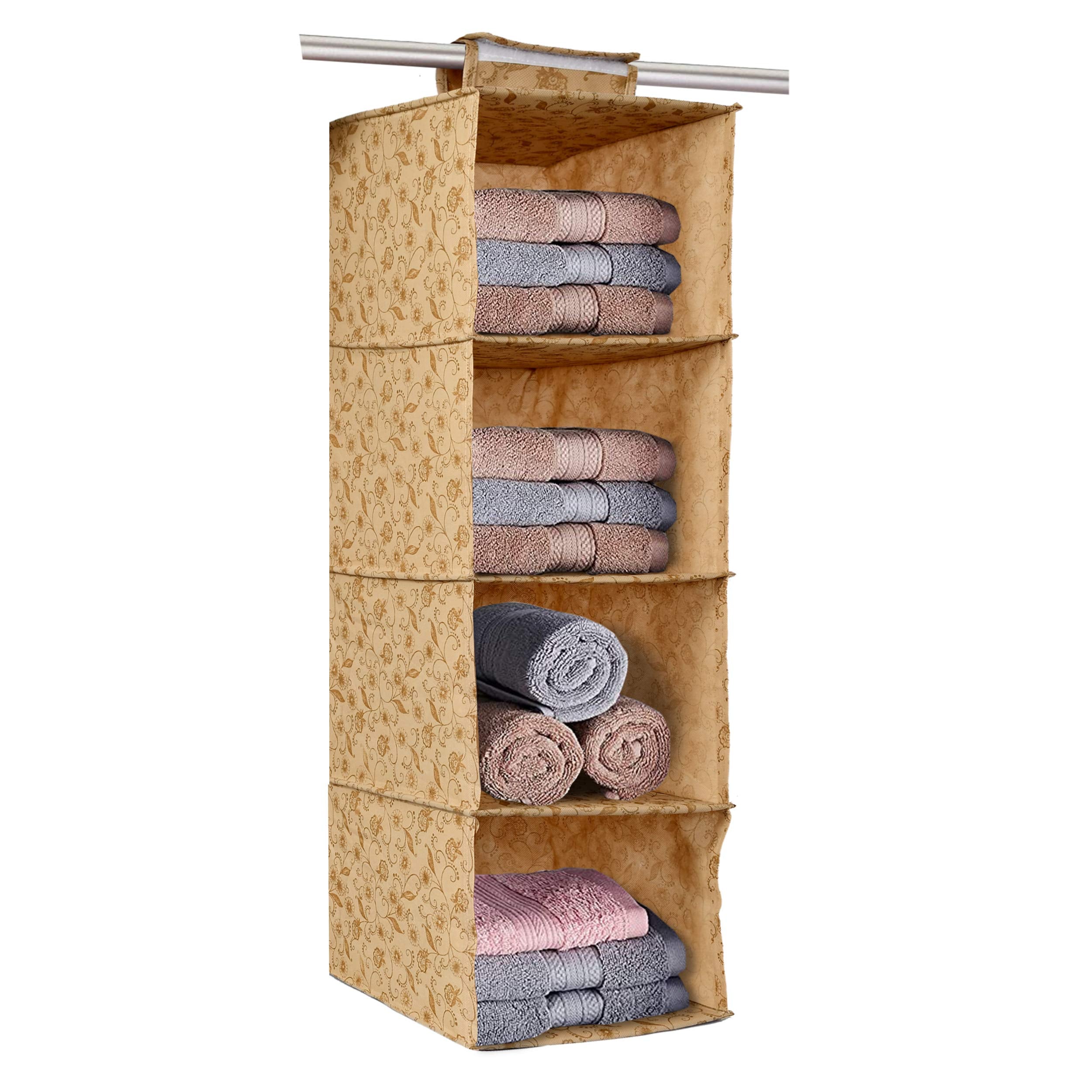 Kuber Industries 4 compartment hanging shelf clothes organizer helps you organize your wardrobe or bathroom neatly and systematically. It is made from heavy 80 GSM non woven fabric with engineered wood inside. All the 4 compartments have hard engineered wood base to make it strong and durable and take the weight of whatever is stored in it as compared to similar products available which have cardboard base only on top & bottom. Kuber Industries 4 shelf wardrobe organizer has a strong loop fastener which hangs easily on any bar/rod creating 4 extra shelves in your wardrobe.Kuber Industries is a customer-loved brand that brings you everything you need to make a house a home. Right from nifty storage solutions to smart kitchen essentials, our products are known for their premium and durable quality.