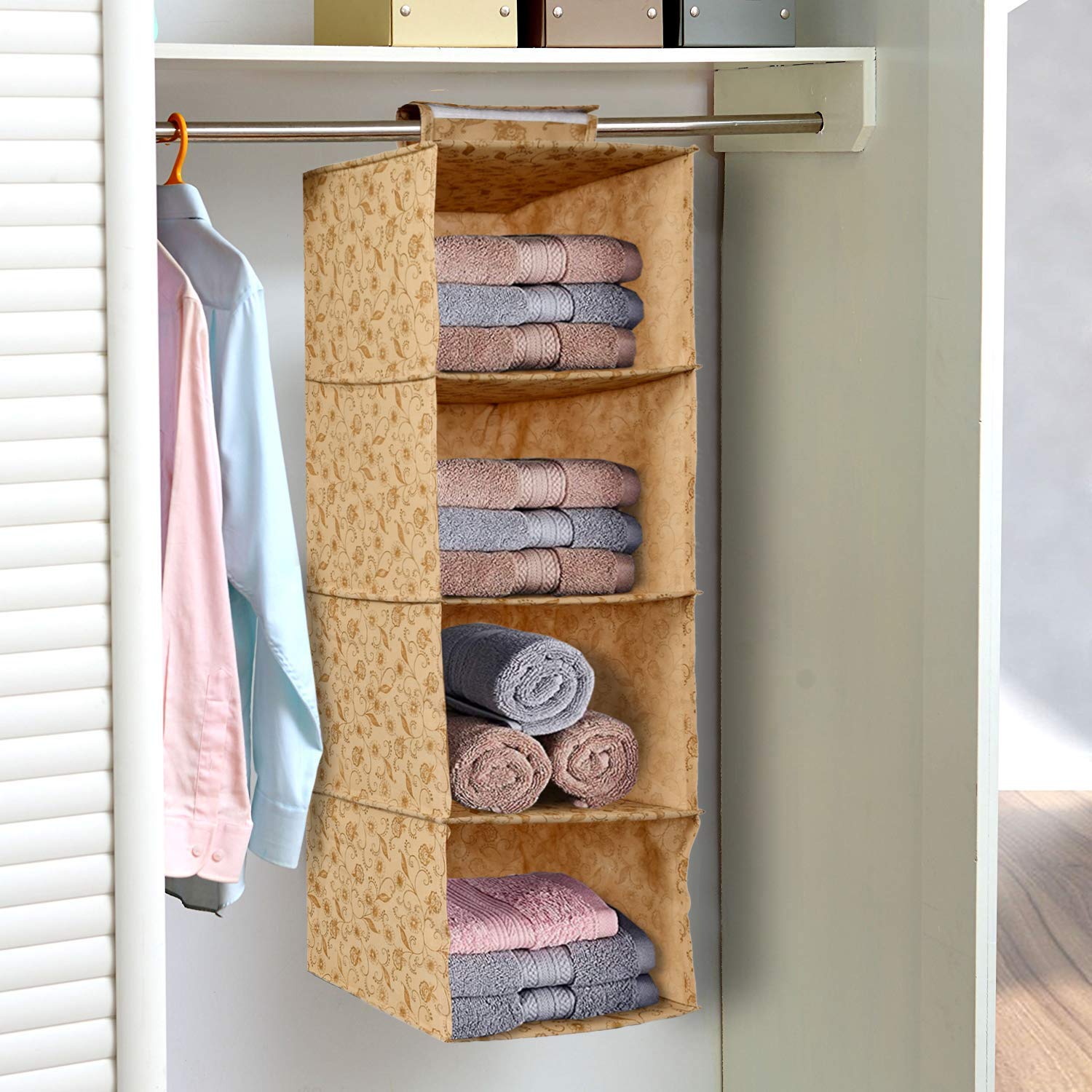 Kuber Industries 4 compartment hanging shelf clothes organizer helps you organize your wardrobe or bathroom neatly and systematically. It is made from heavy 80 GSM non woven fabric with engineered wood inside. All the 4 compartments have hard engineered wood base to make it strong and durable and take the weight of whatever is stored in it as compared to similar products available which have cardboard base only on top & bottom. Kuber Industries 4 shelf wardrobe organizer has a strong loop fastener which hangs easily on any bar/rod creating 4 extra shelves in your wardrobe.Kuber Industries is a customer-loved brand that brings you everything you need to make a house a home. Right from nifty storage solutions to smart kitchen essentials, our products are known for their premium and durable quality.