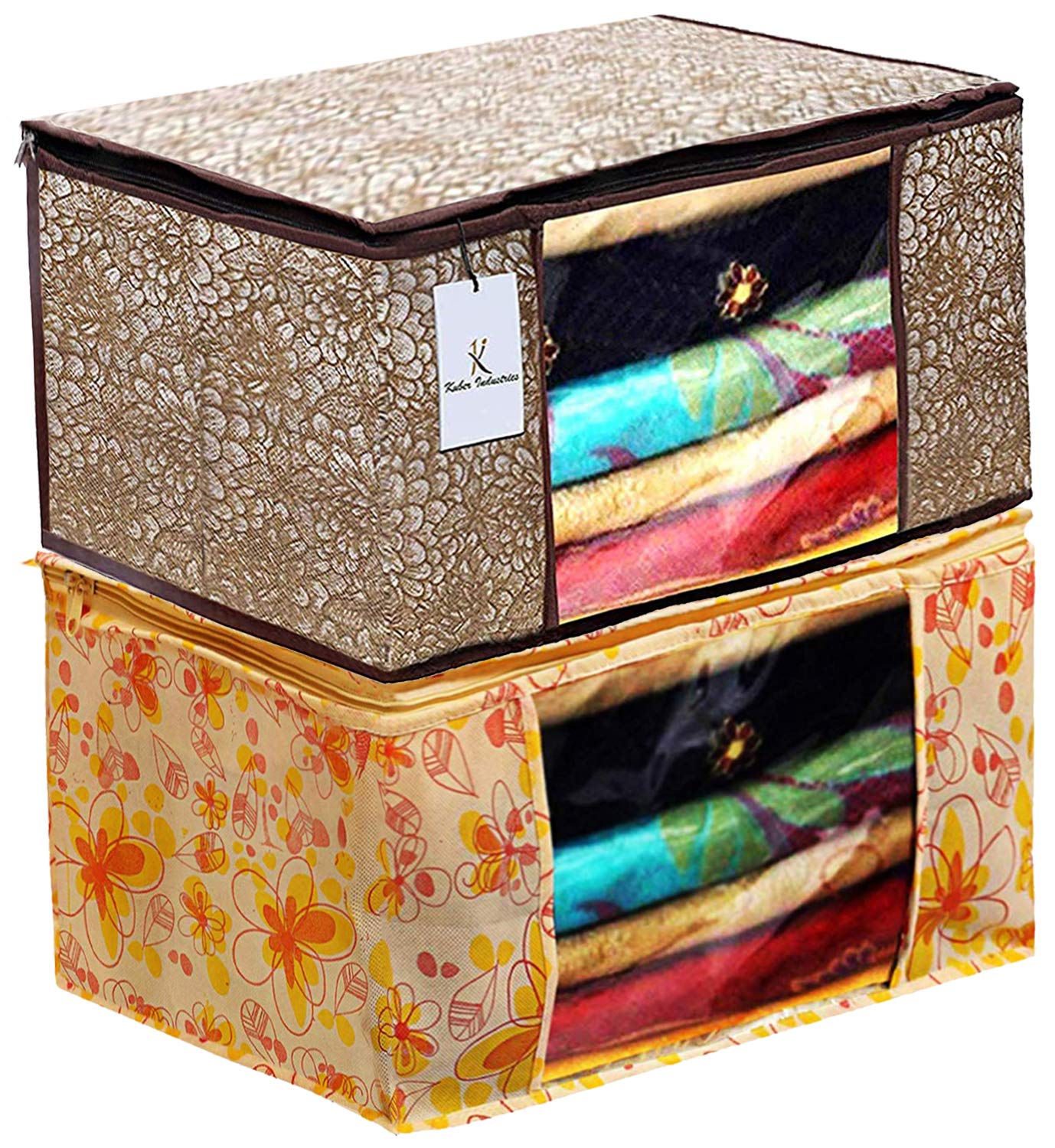 Material: Non Woven, Color: Ivory Red & Golden Brown. Design- Metalic Printed .Package Contents: 2 Piece Saree Cover .Size: 43 cm x 35 cm x 22 cm .Made from durable, wear and tear-resistant non-woven fabric. Lightweight and flexible saree covers .Carefully stitched to offer additional strength. Ideal for storing sarees and protecting them from dust and insects .Transparent see-through window for easy identification of contents. Durable zipper for easy opening and closing