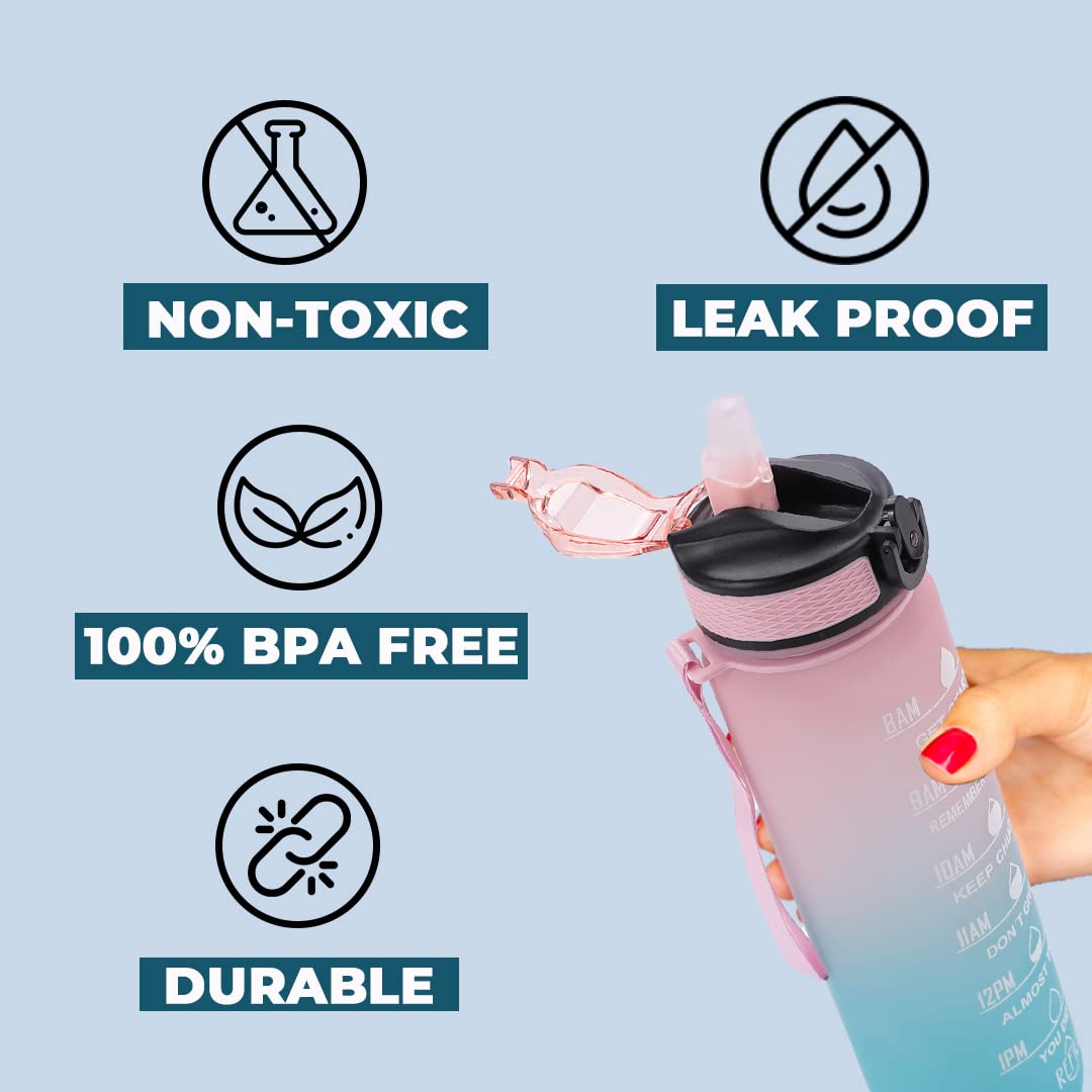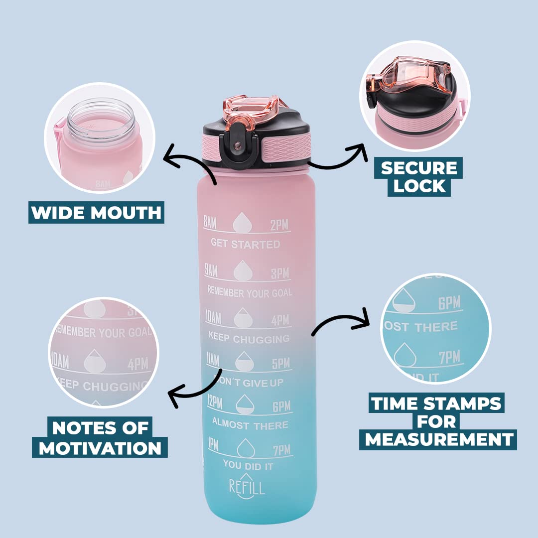 Innovative Time MarkerThis sipper bottle for adults comes with a unique design that comes with motivational quotes & time markers to help you measure your hourly water intake. | Leak-Proof & DurableThis sturdy water bottle for kids & adults is thoughtfully designed to be leak-proof and durable, making it the perfect sipper bottle for adults & kids alike. | Hydrate on the goWith a flip-top lid, an easy-to-use silicon straw, and a leak-proof high-quality plastic body - this sipper bottle for adults is the ideal water bottle to stay hydrated on the go! |