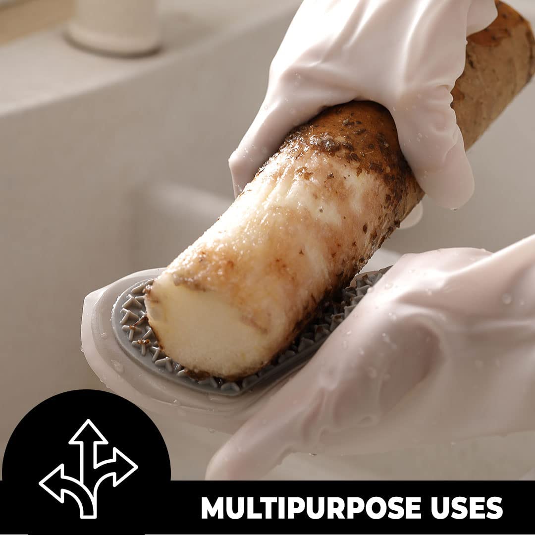 Scrubbing Magic GlovesScrubby, multi-purpose rubber gloves with scrubbers can be used for cleaning dishes, kitchen, toilet, bathroom, car wash, and dog and cat massage. | High Heat ResistantMagic silicone gloves with scrubbers Heat resistant temperatures up to 320 degrees F, 160 degrees C. Easy to use and take off the food. | Efficient CleaningSilicone cleaning gloves provide a better grip that makes them fit for washing dishes. |