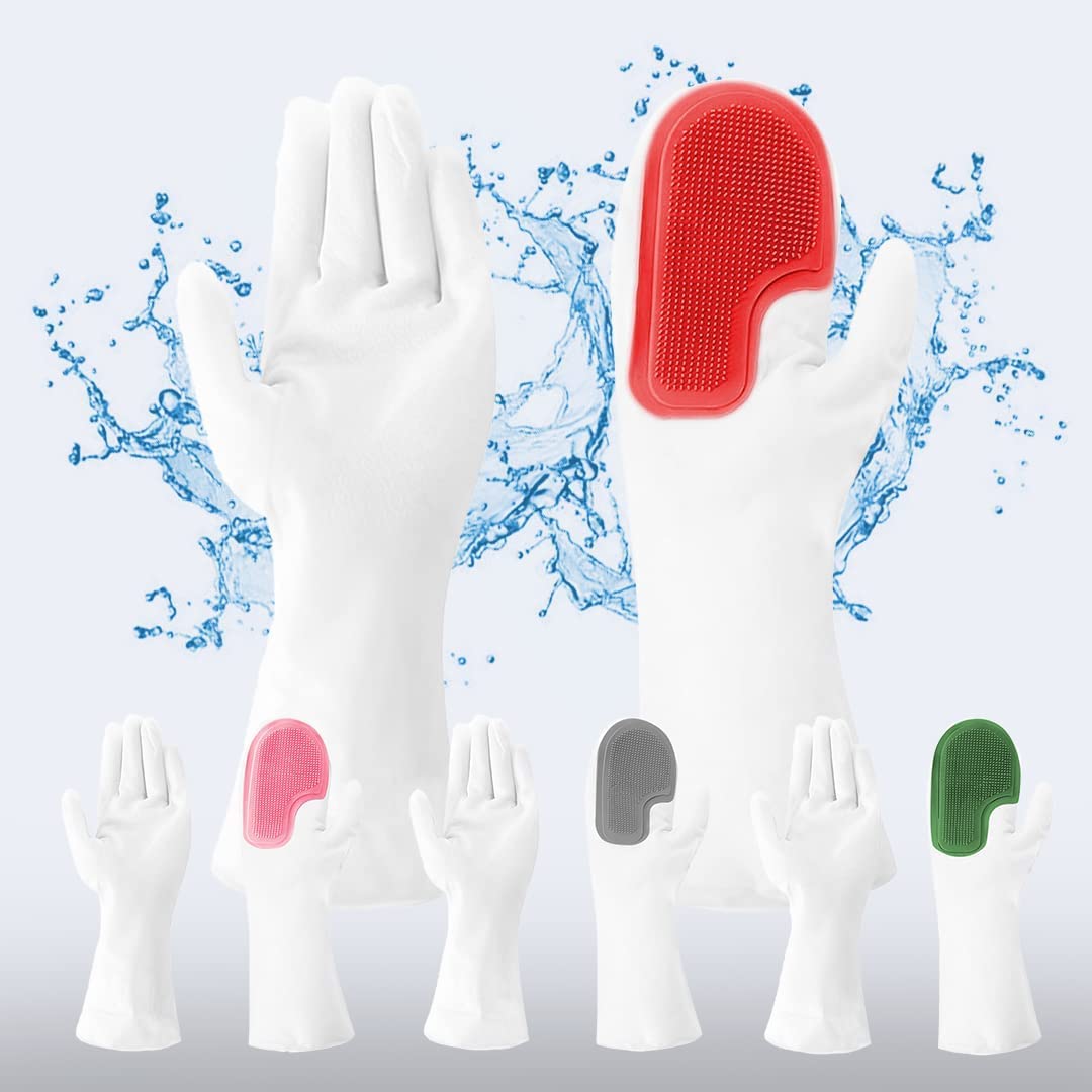 Scrubbing Magic GlovesScrubby, multi-purpose rubber gloves with scrubbers can be used for cleaning dishes, kitchen, toilet, bathroom, car wash, and dog and cat massage. | High Heat ResistantMagic silicone gloves with scrubbers Heat resistant temperatures up to 320 degrees F, 160 degrees C. Easy to use and take off the food. | Efficient CleaningSilicone cleaning gloves provide a better grip that makes them fit for washing dishes. |