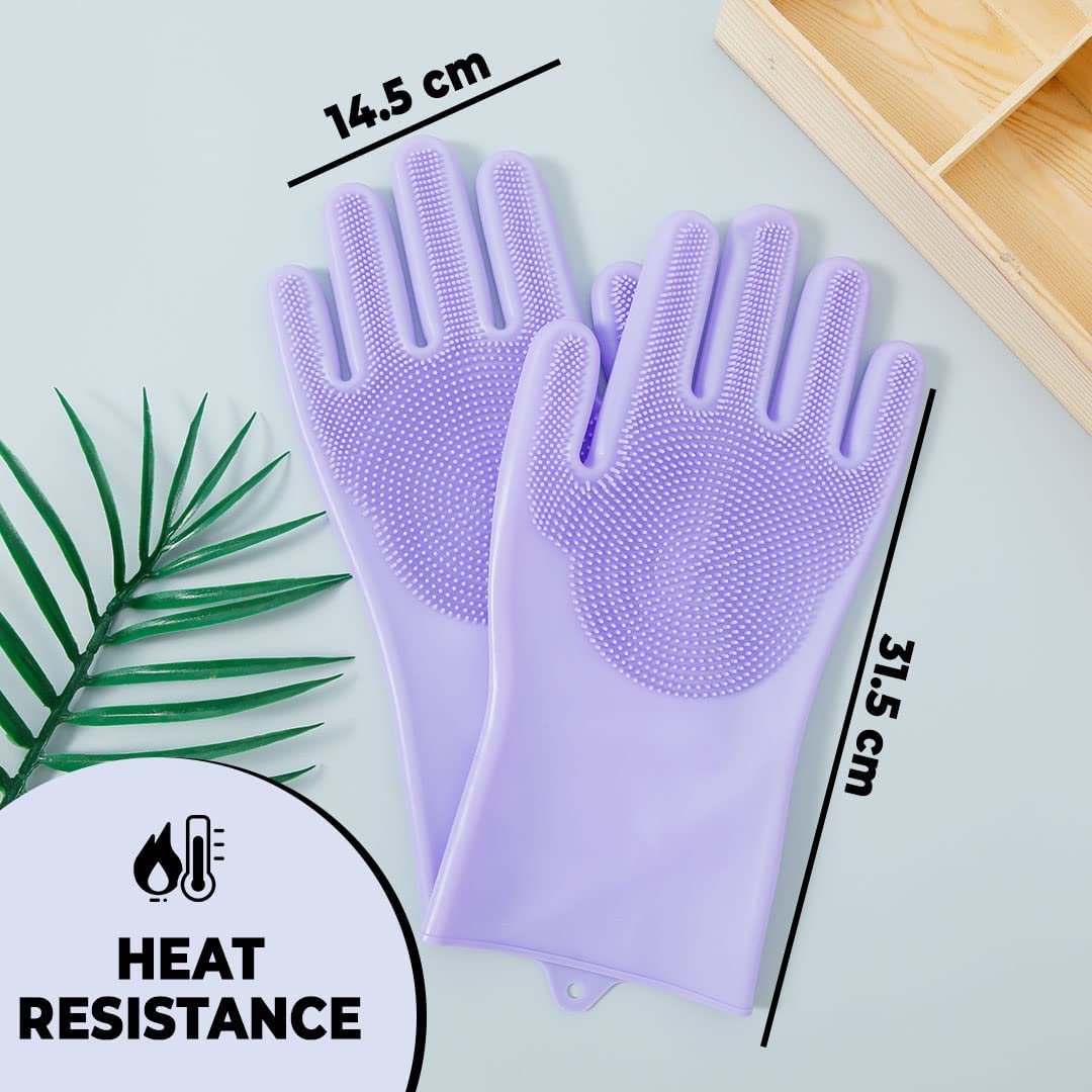 Scrubbing Magic GlovesScrubby, multi-purpose rubber gloves with scrubbers can be used for cleaning dishes, kitchen, toilet, bathroom, car wash, and dog and cat massage. | High Heat ResistantMagic silicone gloves with scrubbers Heat resistant temperatures up to 320 degrees F, 160 degrees C. Easy to use and take off the food. | Efficient CleaningSilicone cleaning gloves provide a better grip that makes them fit for washing dishes. |