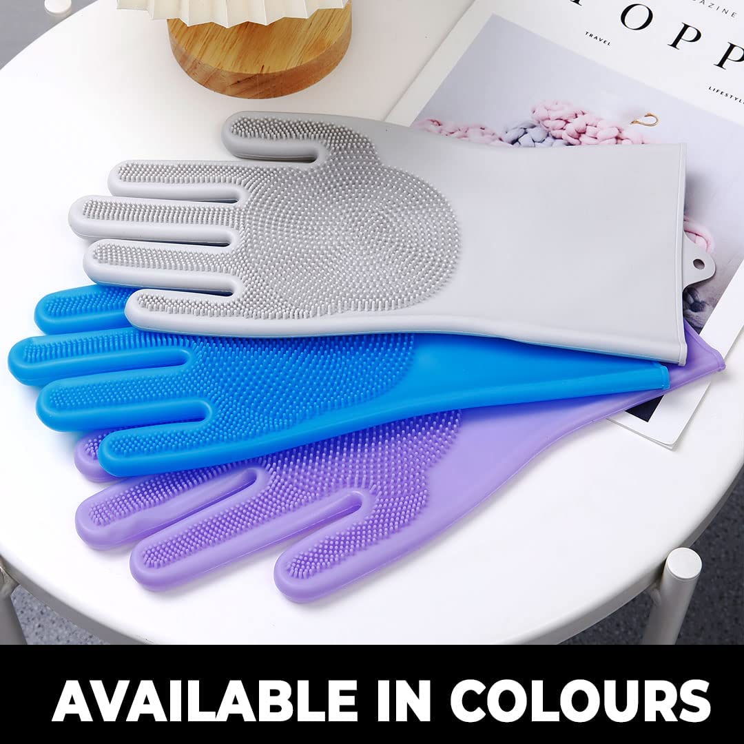 Scrubbing Magic GlovesScrubby, multi-purpose rubber gloves with scrubbers can be used for cleaning dishes, kitchen, toilet, bathroom, car wash, and dog and cat massage. | High Heat ResistantMagic silicone gloves with scrubbers Heat resistant temperatures up to 320 degrees F, 160 degrees C. Easy to use and take off the food. | Efficient CleaningSilicone cleaning gloves provide a better grip that makes them fit for washing dishes. |