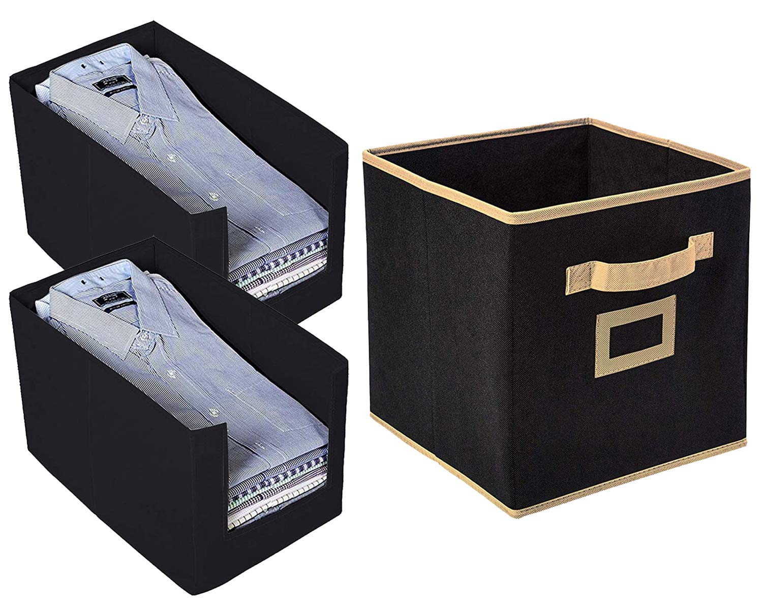 Package Contents: 2 Piece Non Woven Shirt Stacker And 1 Piece Small Foldable Storage Organiser Cubes/Boxes,Material: Non Woven, Color:Black, Design: Plain,Storage Box Size Small : 27 cm x 27 cm x 27 cm, Shirt Stacker : 40 cm x 25 cm x 24 cm ,Care Instructions: Easily Washable,Kuber Industries Shirt Stacker/Storage Box Wardrobe Organizer is made of non-woven material, so this is very durable and has attractive colour design,Simple and elegant organiser to complement various interiors,Ideal for storing toys, clothes, magazines, etc. ,You can arrange and organize more than one shirt and cloth in it, This is made of heavy 80 GSM non-woven fabrics and it can be very useful for you,This shirt stacker is completely collapsible when not in use and this make space in your wardrobe to store more clothes ,Durable: Closet organizer made of thick layer embossing non-woven fabric, delicate, breathable, moisture-proof, mold-proof and dustproof. Hard to be broken and can be used for long period of time,Space Saving Organizer: Foldable to spare space when not being used.convenient Storage box, Shirt Stacker allows easy access for grab and