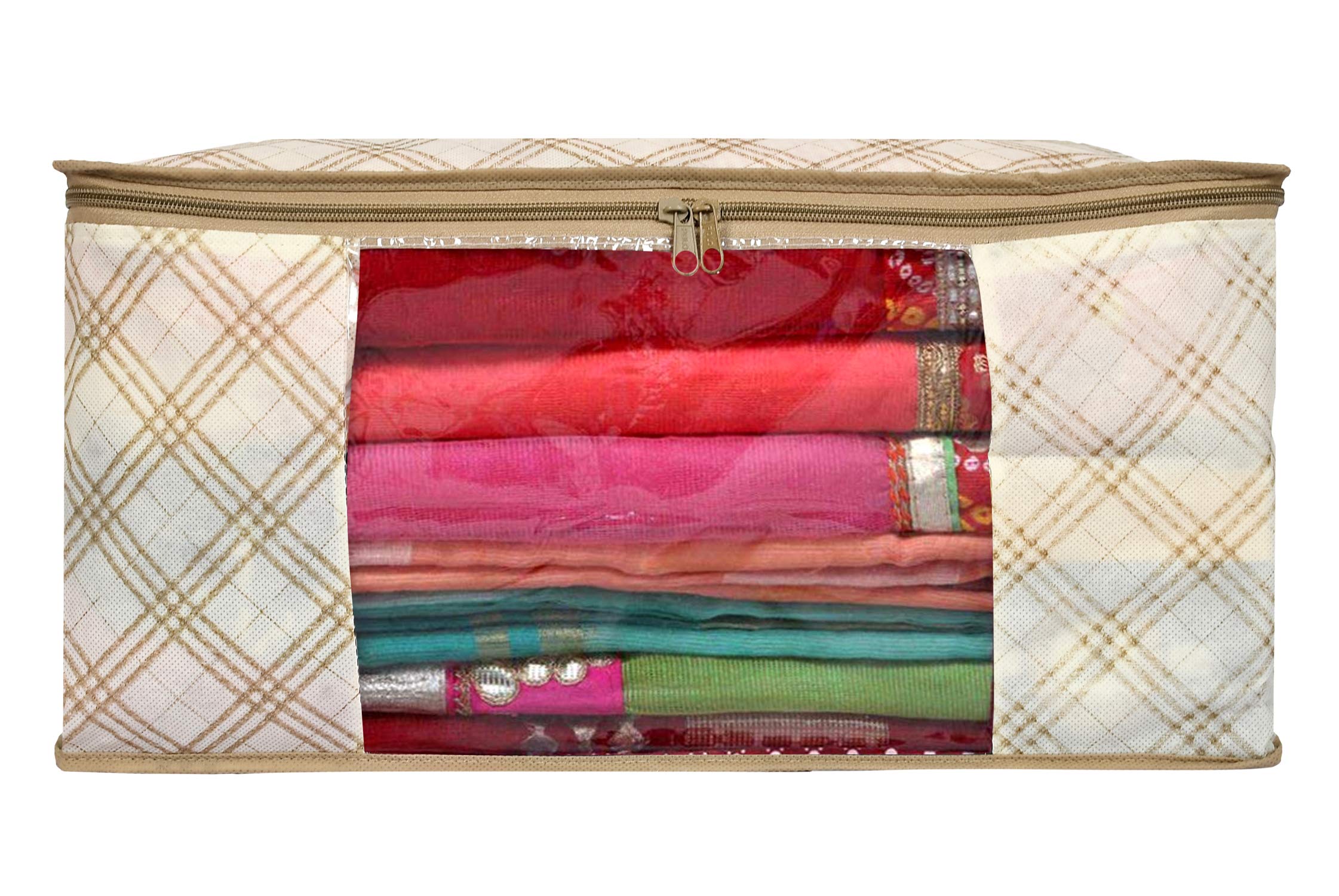 Kuber Industries Non Woven Metalic Checkered Print Saree/Clothes Cover with Window Kuber Industries non woven Metalic Checkered Print saree cover to organize and store your heavy and costly sarees dust, dirt and water safe. This beautiful Metalic Checkered Print makes your wardrobe looks beautiful and organized too. Transparent front window gives you the convenience of better visibility. 2 premium quality zippers for easy opening and closing. Made of VIRGIN 90 GSM non woven fabric makes it durable and water repellent too. Best option to use while travelling.Large Front Window to instantly know what is kept inside without opening the bag again and again.Cotton breathable fabric to keep your stuff inside protected from dust dirt and bad spell. Quilted from all the sides to give cushion to whatever is stored inside.DescriptionKuber Industries is a customer-loved brand that brings you everything you need to make a house a home. Right from nifty storage solutions to smart kitchen essentials, our products are known for their premium and durable quality.