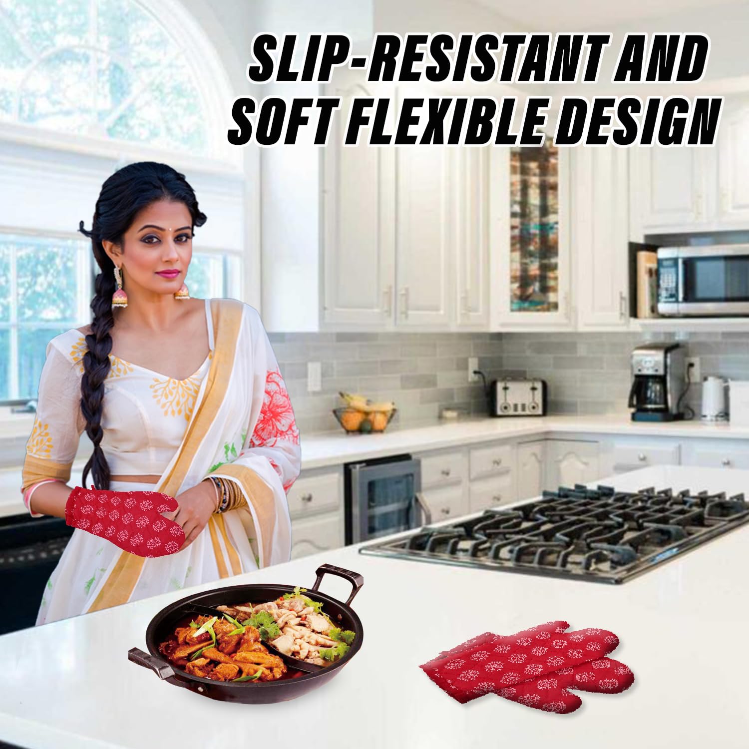 Kuber Industries Presents these Oven Mitts, which are heat-resistant gloves designed to protect hands when handling hot cookware, such as pots and pans, in and around the oven. They are typically made of materials like silicone or neoprene, offering excellent insulation and grip. The mitts are often lined with cotton or other soft, breathable materials to ensure comfort during use. They are perfectly designed to fit different hand sizes and cater to specific needs. Undoubtedly, this is an exceptional gift for hands.Detailed Specifications: