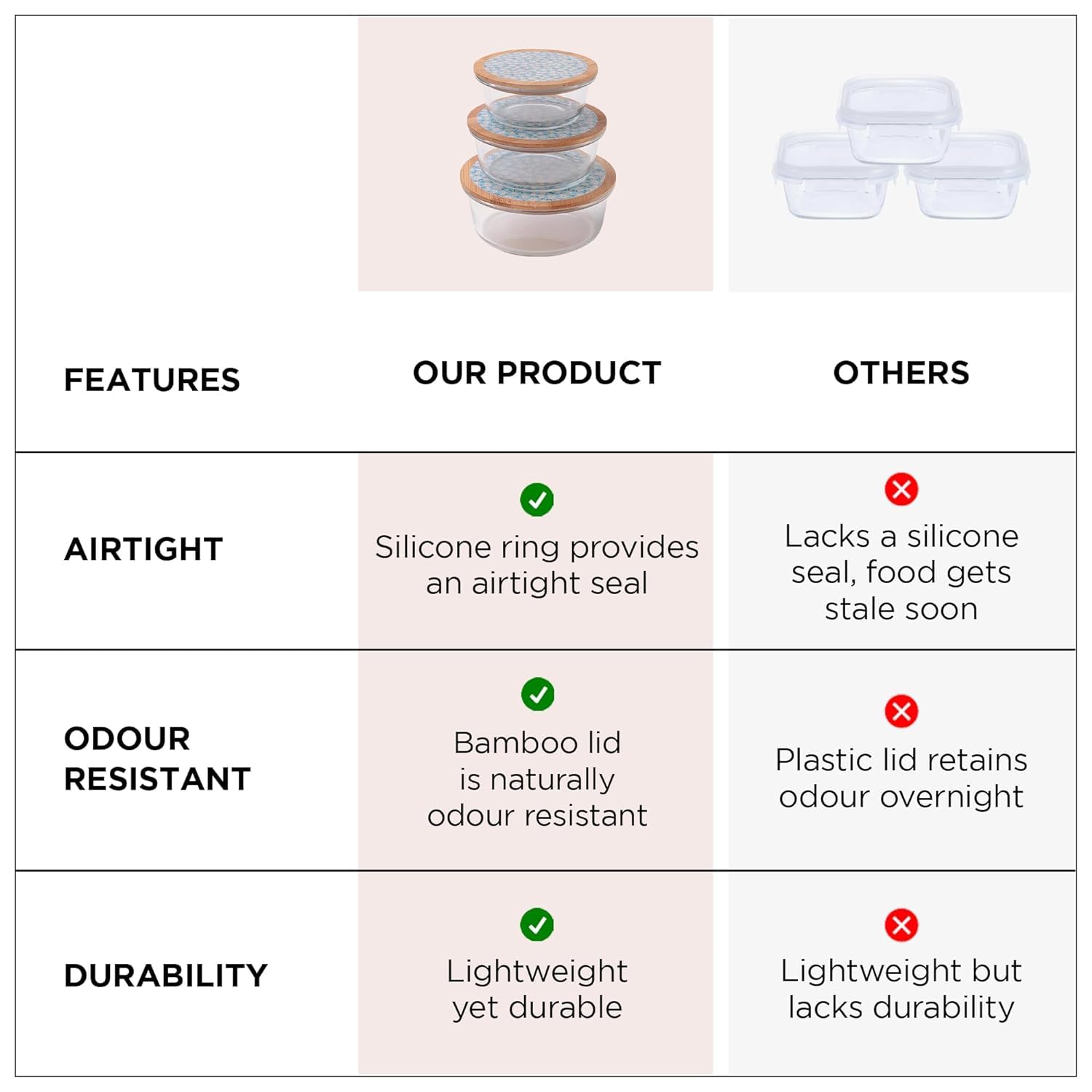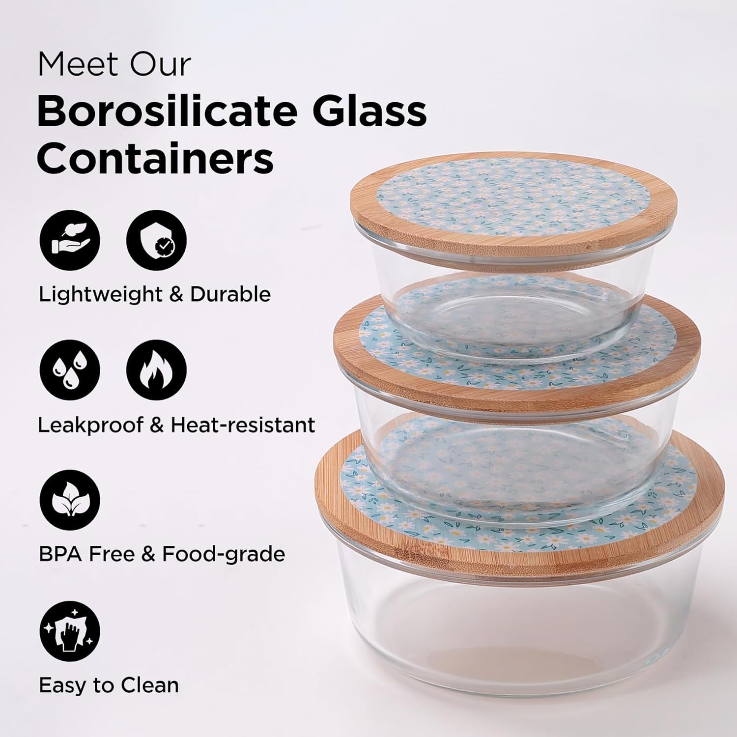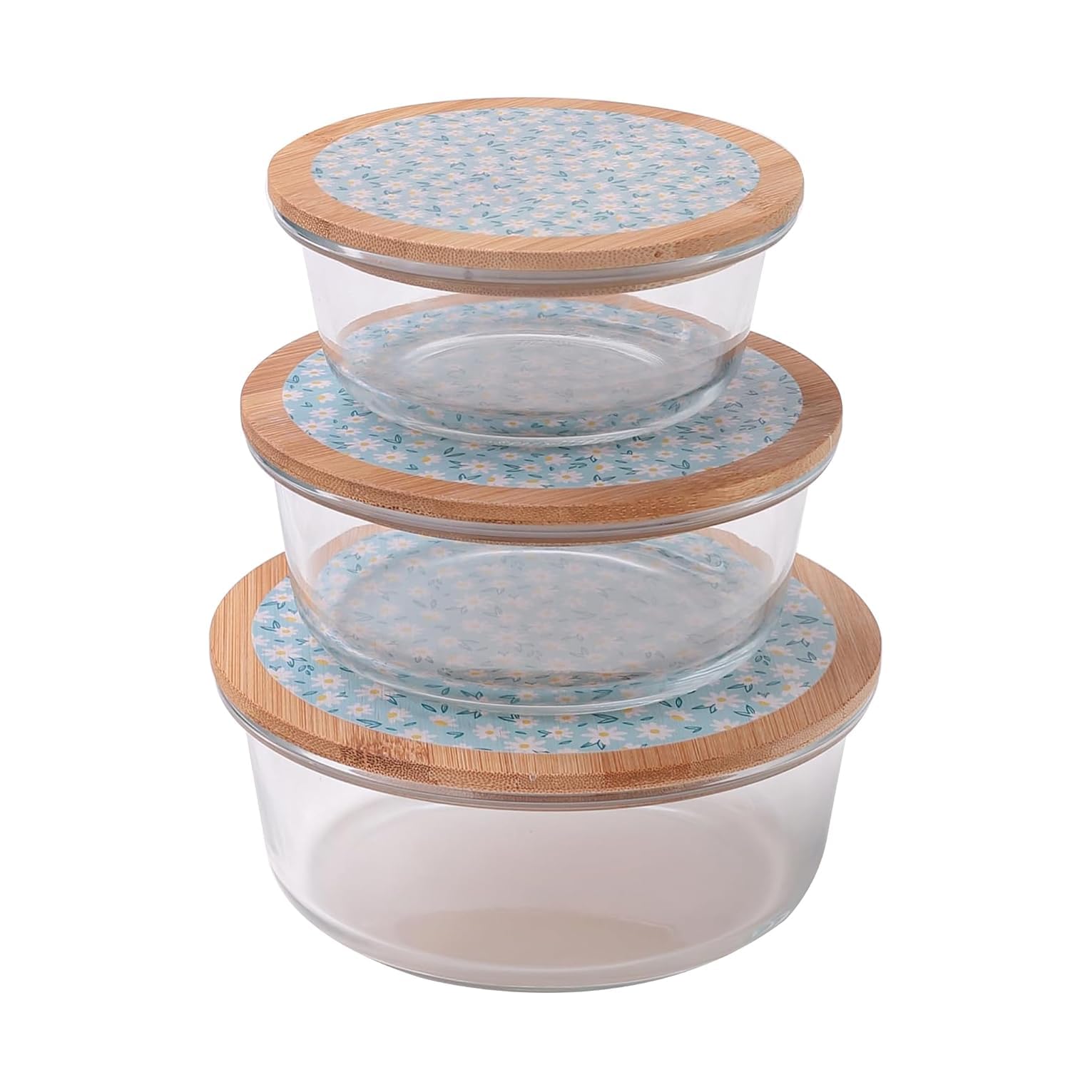 Introducing Kuber Industries 's Pack of 3 Borosilicate Glass Kitchen containers set with bamboo lid. These airtight round fridge storage boxes are perfect for storing grains, pulses, spices, snacks, tea, coffee, sugar, salt, nuts, and more. The transparent glass jars with Dandy Daisies print are not only functional but also aesthetically pleasing. These premium quality Kitchen accessories items containers feature a borosilicate body with an airtight bamboo lid that has a food-grade silicone ring for a secure seal. The wide mouth and large capacity of 390ml, 620ml, and 960ml make them versatile for storing a variety of items like dry fruits, flour, fruits, vegetables, and more. Kuber Industries 's kitchen containers are lightweight, odor and stain resistant, BPA-free, leakproof, spillproof, and temperature resistant. They offer crystal clear clarity, making it easy to identify the contents inside. Additionally, they are easy to clean, dishwasher safe, freezer safe, and microwave safe, providing convenience for everyday use. Designed for mothers, families, and wives, these containers are perfect for gifting or use in the kitchen, cabinets, or lunch boxes. Customers love the high quality, durability, and aesthetically pleasing design of these containers. They are motivated by the recommendation, aesthetic appeal, value for money, and quality that Kuber Industries offers. Kuber Industries 's Pack of 3 Borosilicate Glass Kitchen airtight containers set with bamboo lid not only addresses lid issues, seal/vacuum issues, and quality/craftsmanship concerns that customers may have but exceeds expectations with its superior functionality and design. Experience the convenience and elegance of Kuber Industries 's kitchen containers for all your storage needs. Get yours today!Detailed Specifications: