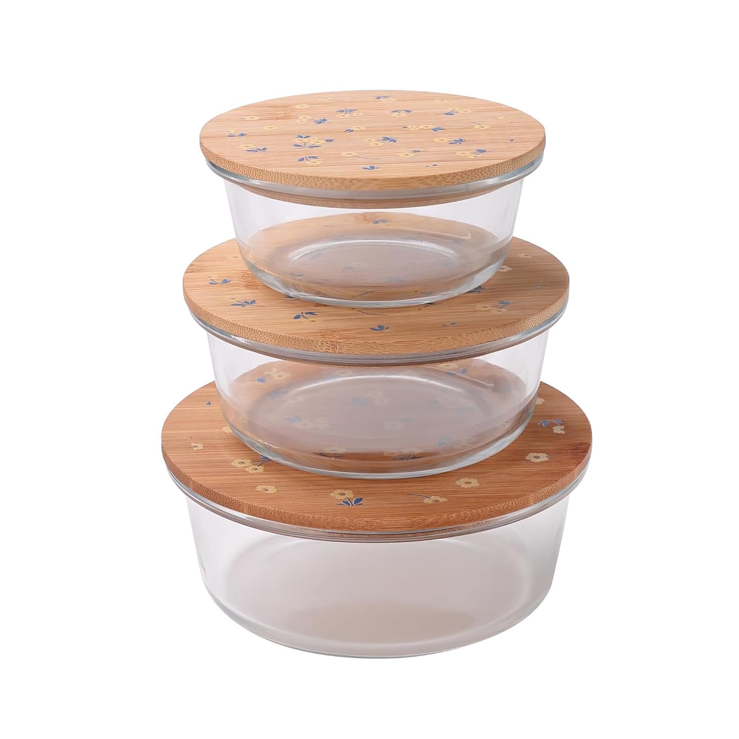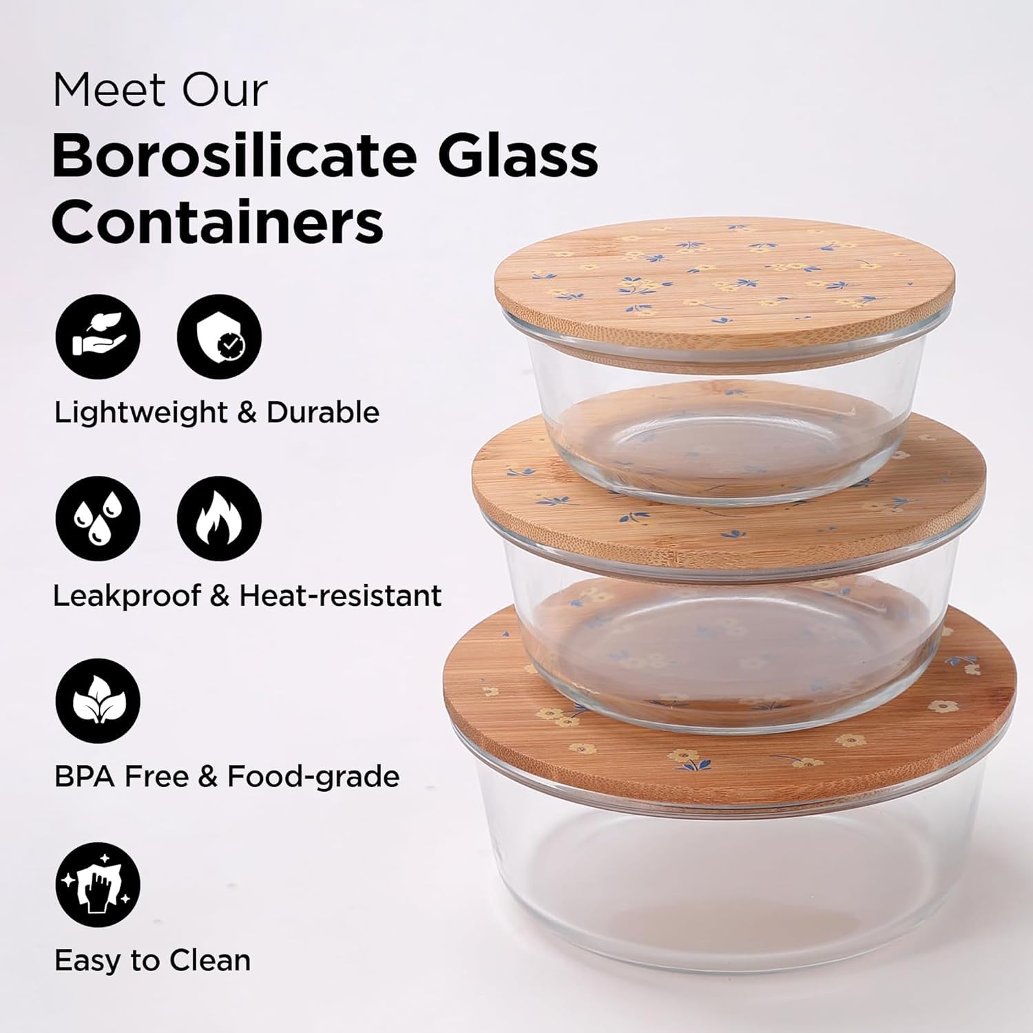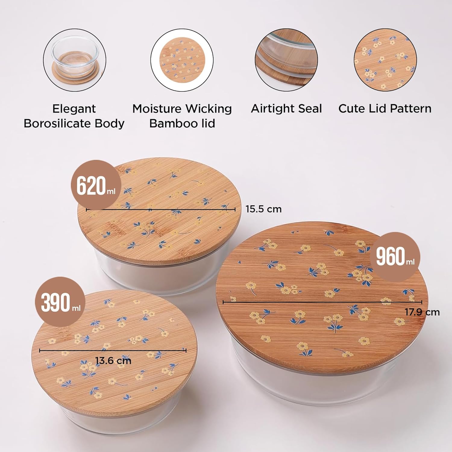Introducing Homestic 's Pack of 3 Borosilicate Glass Kitchen airtight containers set with bamboo lid. These airtight round fridge storage boxes are perfect for storing grains, pulses, spices, snacks, tea, coffee, sugar, salt, nuts, and more. The transparent glass jars with Happy Dance print are not only functional but also aesthetically pleasing. These premium quality containers feature a borosilicate body with an airtight bamboo lid that has a food-grade silicone ring for a secure seal. The wide mouth and large capacity of 390ml, 620ml, and 960ml make them versatile for storing a variety of items like dry fruits, flour, fruits, vegetables, and more. Homestic 's kitchen airtight containers set are lightweight, odor and stain resistant, BPA-free, leakproof, spillproof, and temperature resistant. They offer crystal clear clarity, making it easy to identify the contents inside. Additionally, they are easy to clean, dishwasher safe, freezer safe, and microwave safe, providing convenience for everyday use. Designed for mothers, families, and wives, these containers are perfect for gifting or use in the kitchen, cabinets, or lunch boxes. Customers love the high quality, durability, and aesthetically pleasing design of these containers. They are motivated by the recommendation, aesthetic appeal, value for money, and quality that Homestic offers. Homestic 's Pack of 3 Borosilicate Glass Kitchen containers set with bamboo lid not only addresses lid issues, leakage and spillage issues, and quality and craftsmanship concerns that customers may have but exceeds expectations with its superior functionality and design. Experience the convenience and elegance of Homestic 's kitchen containers for all your storage needs. Get yours today!Detailed Specifications: