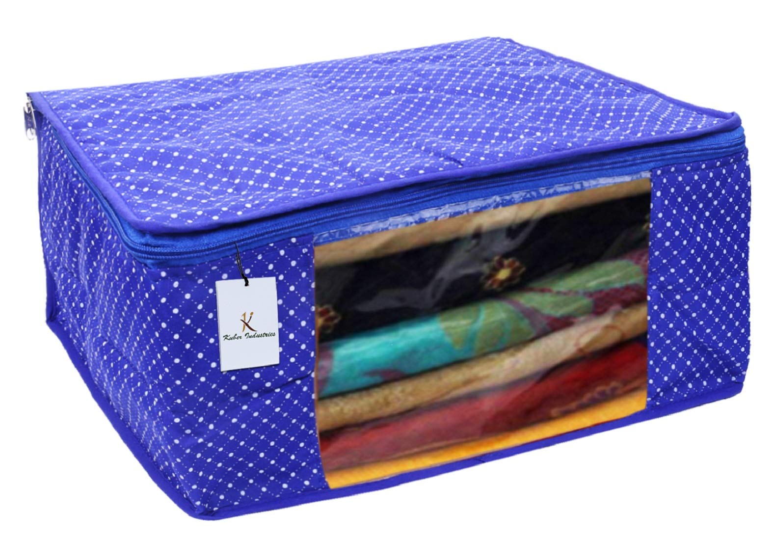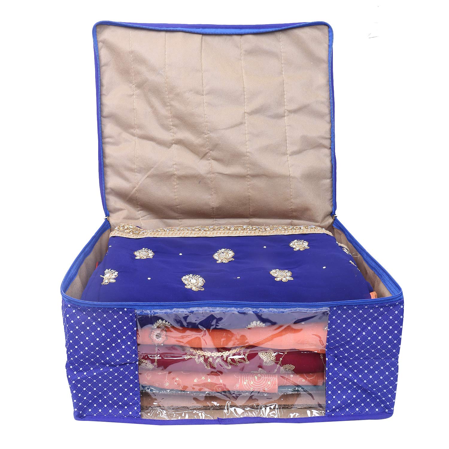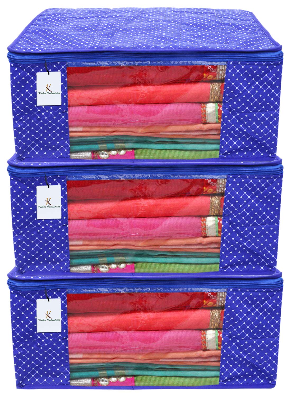 Set of 3 pieces in heavy quilted cotton polka dots material. Dimension-17 x 8 x 14 inches. It's a best option to use while travelling and it will help you to keep your saree in a separate cover from other items in your luggage. Prevent your favourite silk/cotton sarees from dust and moisture.Detailed Specifications: