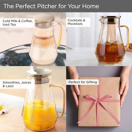 Introducing the Kuber Industries Premium 1.4 Ltr Glass Jug with Stainless Steel Lid and Handle, a stunning addition to your kitchen arsenal. Crafted from high-quality borosilicate glass, this jug embodies elegance and functionality. Its scratch-resistant and lightweight design ensures durability, while the non-porous surface makes cleaning a breeze. With an ergonomic handle providing a firm grip, pouring becomes effortless, enhancing your serving experience. This multipurpose jug features a stainless-steel strainer lid, perfect for filtering beverages, and a large 1400ml capacity ideal for serving juice, water, cocktails, mocktails, and more. Its wide mouth facilitates easy filling and cleaning, complemented by the easy pour spout for mess-free serving. The captivating amber hue adds a touch of aesthetic appeal to any setting, making it a stylish addition to your dining table. Ideal for daily use or special occasions, any drink is best enjoyed from this elegant glass jug set. It's not only stylish but also strong, durable, and chip-resistant, ensuring long-lasting performance. Give it as a gift to your family and friends for housewarmings or special celebrations, and let them indulge in the luxury of Kuber Industries Premium. Designed for the discerning juice lover, this jug boasts an innovative octagonal design, setting it apart from the rest. Plus, with our Perfect-Delivery Guarantee, you can trust that your jug will arrive in pristine condition, ready to impress. Packaged securely in a plain craft box with proper insulation, rest assured that your jug will be delivered safely, ensuring a worry-free experience. Embrace luxury and functionality with the Kuber Industries Premium Glass Jug Set, where every sip is a delight. Whether you're enjoying a refreshing drink at home or hosting a party, this jug is the perfect companion. Add a touch of sophistication to your beverage service with Kuber Industries Premium, the epitome of style and quality.Detailed Specifications: