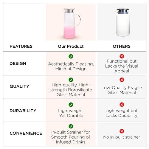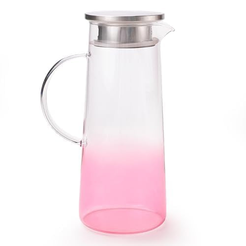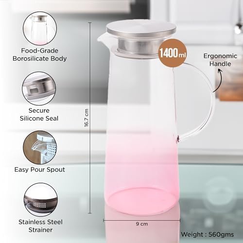Introducing the Kuber Industries Premium 1.4 Ltr Glass Jug with Stainless Steel Lid and Handle, a stunning addition to your kitchen arsenal. Crafted from high-quality borosilicate glass, this jug embodies elegance and functionality. Its scratch-resistant and lightweight design ensures durability, while the non-porous surface makes cleaning a breeze. With an ergonomic handle providing a firm grip, pouring becomes effortless, enhancing your serving experience. This multipurpose jug features a stainless-steel strainer lid, perfect for filtering beverages, and a large 1400ml capacity ideal for serving juice, water, cocktails, mocktails, and more. Its wide mouth facilitates easy filling and cleaning, complemented by the easy pour spout for mess-free serving. The captivating pink hue adds a touch of aesthetic appeal to any setting, making it a stylish addition to your dining table. Ideal for daily use or special occasions, any drink is best enjoyed from this elegant glass jug set. It's not only stylish but also strong, durable, and chip-resistant, ensuring long-lasting performance. Give it as a gift to your family and friends for housewarmings or special celebrations and let them indulge in the luxury of Kuber Industries Premium. Designed for the discerning juice lover, this jug boasts an innovative octagonal design, setting it apart from the rest. Plus, with our Perfect-Delivery Guarantee, you can trust that your jug will arrive in pristine condition, ready to impress. Packaged securely in a plain craft box with proper insulation, rest assured that your jug will be delivered safely, ensuring a worry-free experience. Embrace luxury and functionality with the Kuber Industries Premium Glass Jug Set, where every sip is a delight. Whether you're enjoying a refreshing drink at home or hosting a party, this jug is the perfect companion. Add a touch of sophistication to your beverage service with Kuber Industries Premium, the epitome of style and quality.Detailed Specifications:
