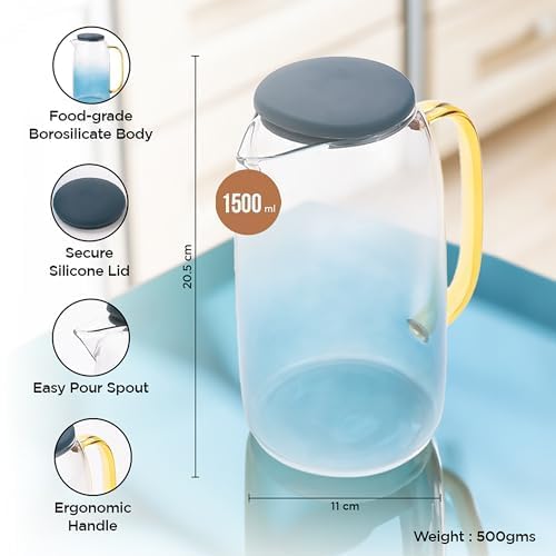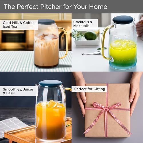 Introducing the Kuber Industries Premium 1.5 Ltr Glass Jug with Silicone Lid and Handle, a stunning addition to your kitchen arsenal. Crafted from high-quality borosilicate glass, this jug embodies elegance and functionality. Its scratch-resistant and lightweight design ensures durability, while the non-porous surface makes cleaning a breeze. With an ergonomic handle providing a firm grip, pouring becomes effortless, enhancing your serving experience. This multipurpose jug features a silicone lid, perfect for filtering beverages, and a large 1500ml capacity ideal for serving juice, water, cocktails, mocktails, and more. Its wide mouth facilitates easy filling and cleaning, complemented by the easy pour spout for mess-free serving. The captivating blue hue adds a touch of aesthetic appeal to any setting, making it a stylish addition to your dining table. Ideal for daily use or special occasions, any drink is best enjoyed from this elegant glass jug set. It's not only stylish but also strong, durable, and chip-resistant, ensuring long-lasting performance. Give it as a gift to your family and friends for housewarmings or special celebrations and let them indulge in the luxury of Kuber Industries Premium. Designed for the discerning juice lover, this jug boasts an innovative octagonal design, setting it apart from the rest. Plus, with our Perfect-Delivery Guarantee, you can trust that your jug will arrive in pristine condition, ready to impress. Packaged securely in a plain craft box with proper insulation, rest assured that your jug will be delivered safely, ensuring a worry-free experience. Embrace luxury and functionality with the Kuber Industries Premium Glass Jug Set, where every sip is a delight. Whether you're enjoying a refreshing drink at home or hosting a party, this jug is the perfect companion. Add a touch of sophistication to your beverage service with Kuber Industries Premium, the epitome of style and quality.Detailed Specifications: