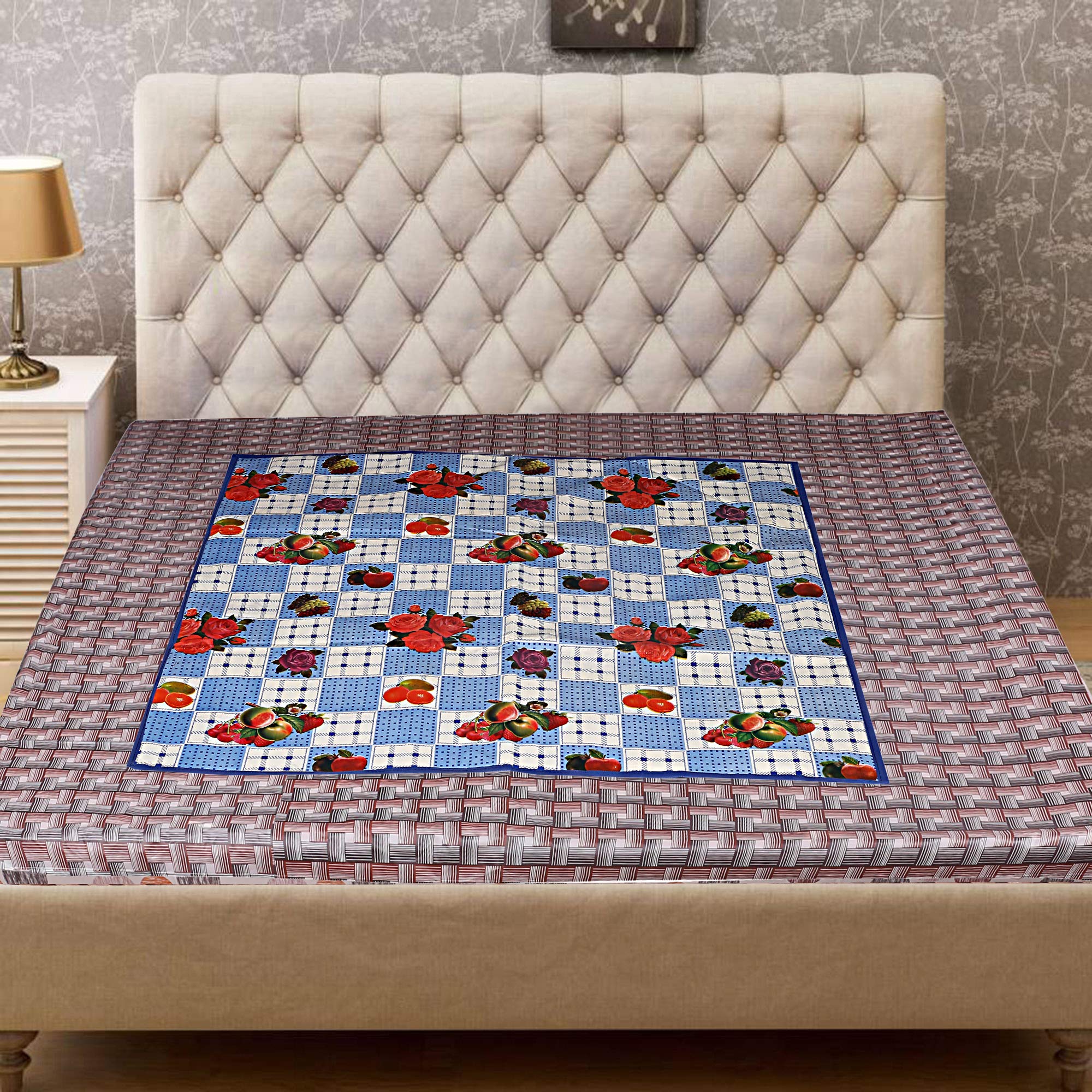 Printed pvc plastic reversible/ this product is used for those who are used to having food on the bed. Protects your bed and bed sheet from getting dirty,care instructions:wipe with moist cloth, dip dry, dry in shade,do not scrub, do not rinse, do not squeeze,do not machine wash