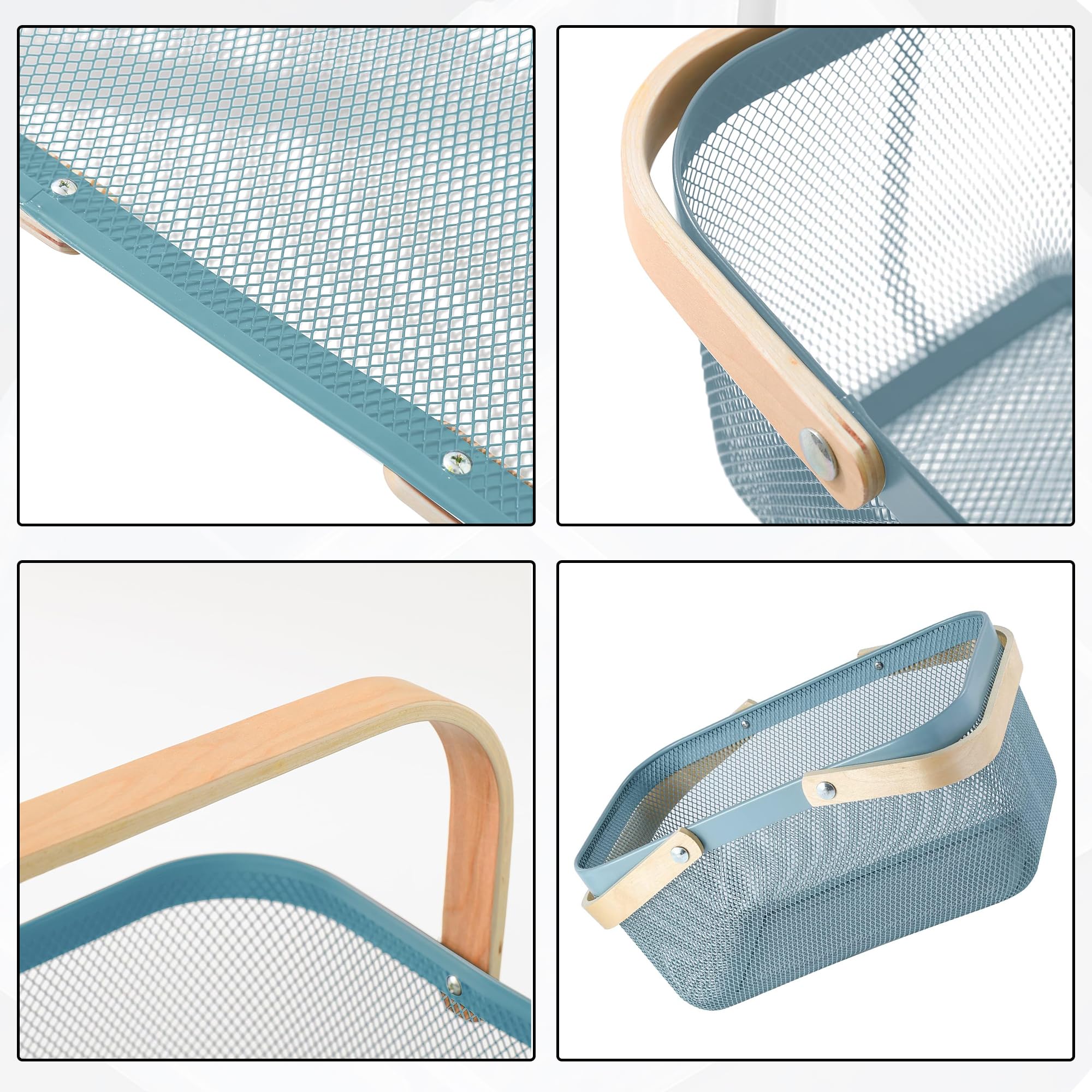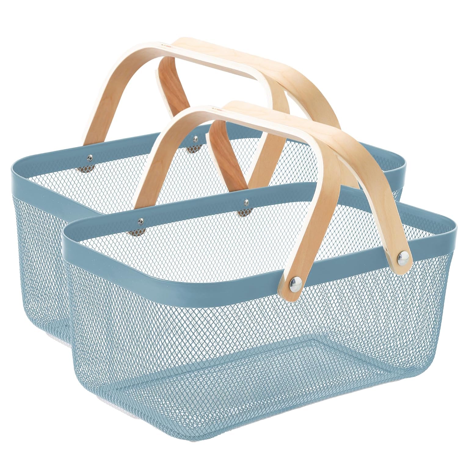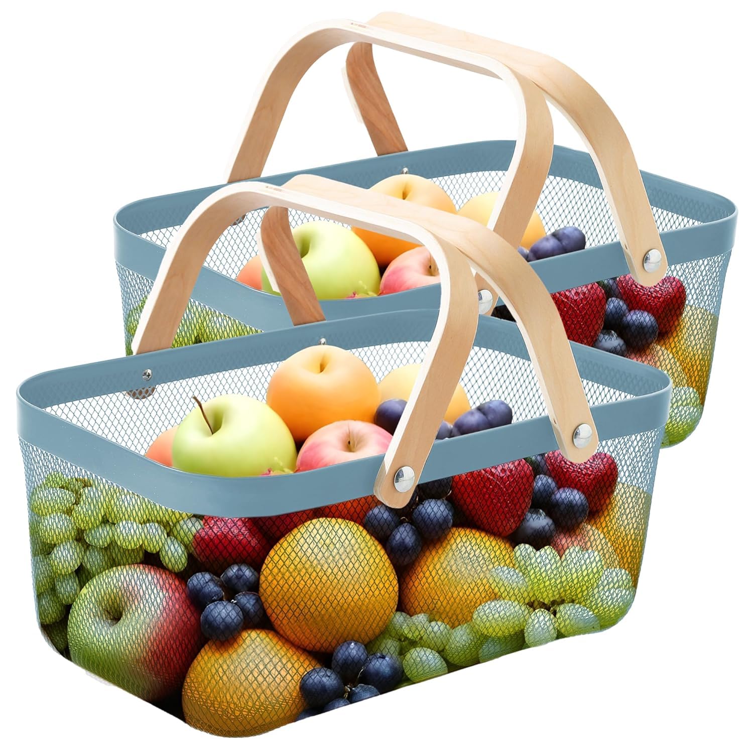 Introducing Kuber Industries 's versatile baskets for all your storage needs. These metal mesh wire baskets, with a beautiful blue color and wooden handle, are designed to provide maximum functionality while adding a touch of style to your home. The pack of 2 baskets offers a large capacity for all your storage requirements, making them perfect baskets for organizing home & also act as kitchen organizer, bathroom, bedroom, or office. The sturdy handle and stable base ensure the baskets can hold a variety of items without any hassle, while the anti-rust surface guarantees durability for long-term use. The fast drainage and breathable storage design of these baskets make them ideal for storing fruits, vegetables, toiletries, clothes, books, and more. The lightweight construction and wider space offer convenience and ease of use for everyday storage needs. Kuber Industries 's baskets are not only practical but also present a presentable option for organizing your household items. Customers appreciate the reliable brand reputation, good packaging, and the overall usefulness of these baskets. Whether you are a kid, mother, or daughter, these multipurpose baskets cater to all your storage requirements. From pantry organization to classroom storage, grocery shopping to picnic essentials, these baskets are the perfect solution for keeping your space clutter-free. With Kuber Industries 's Baskets for Storage, say goodbye to concerns about sturdiness, quality, or size. These baskets are designed to exceed customer expectations, providing a reliable and convenient storage solution for all your needs. Invest in these versatile baskets today and experience the convenience and satisfaction of organized living.Detailed Specifications: