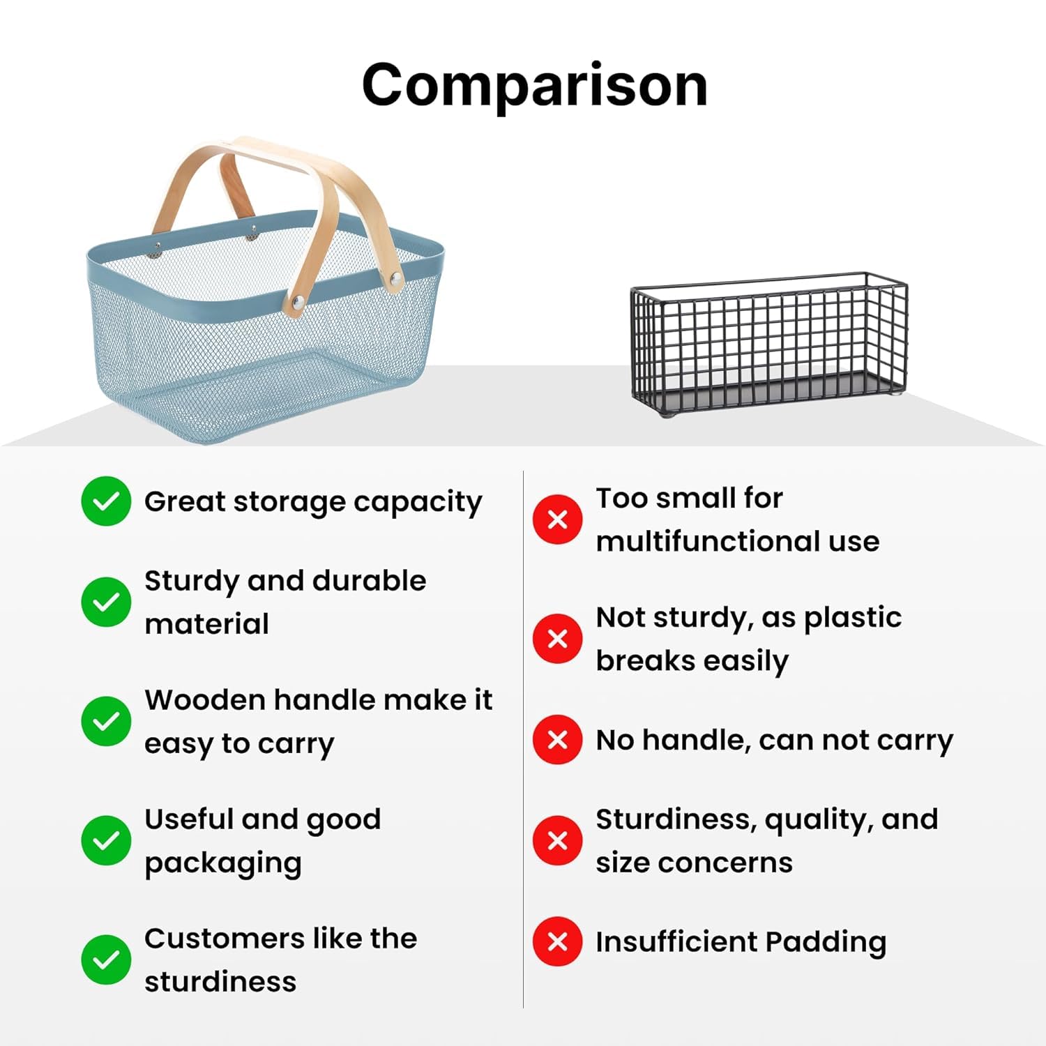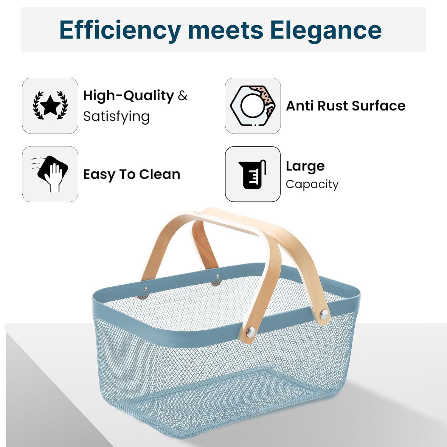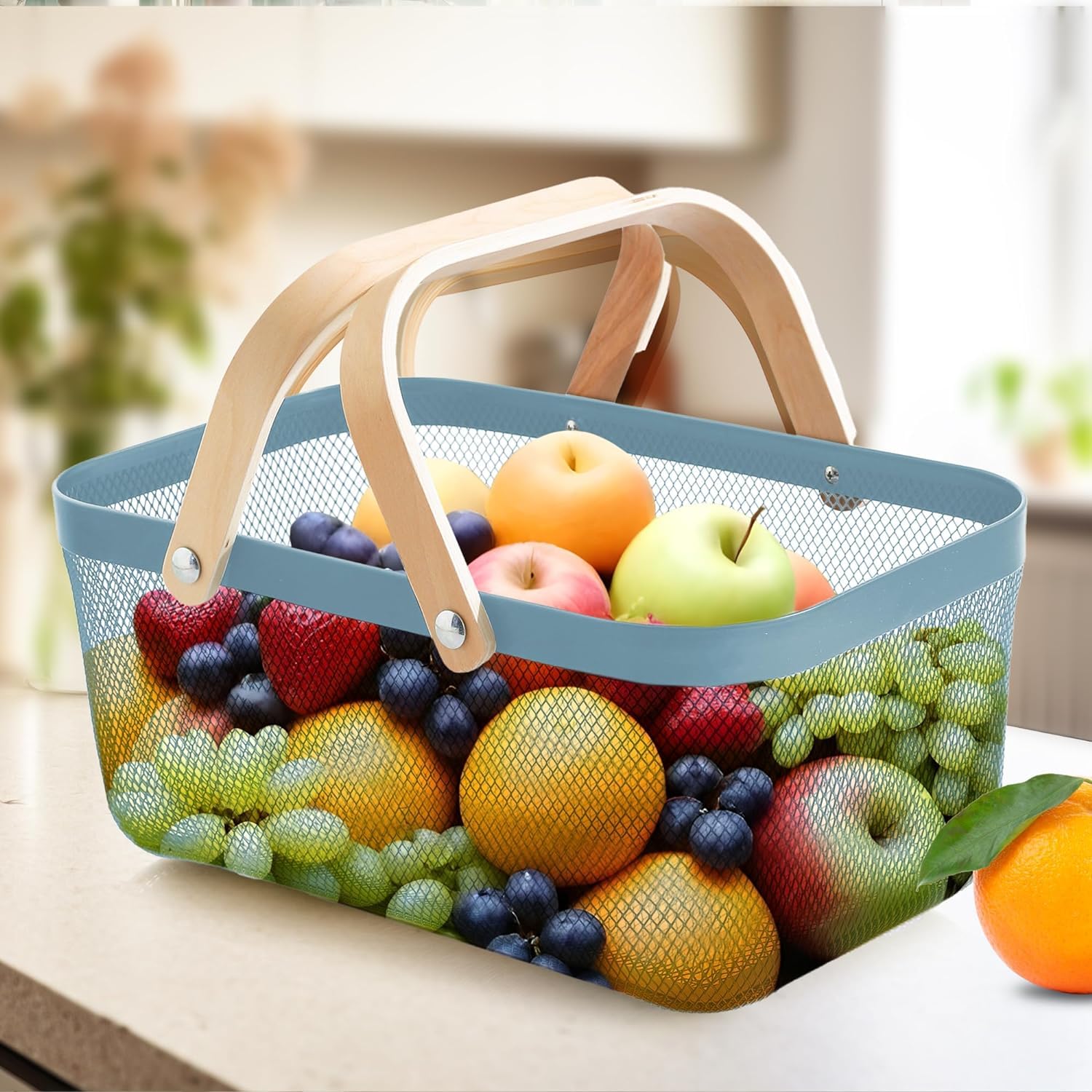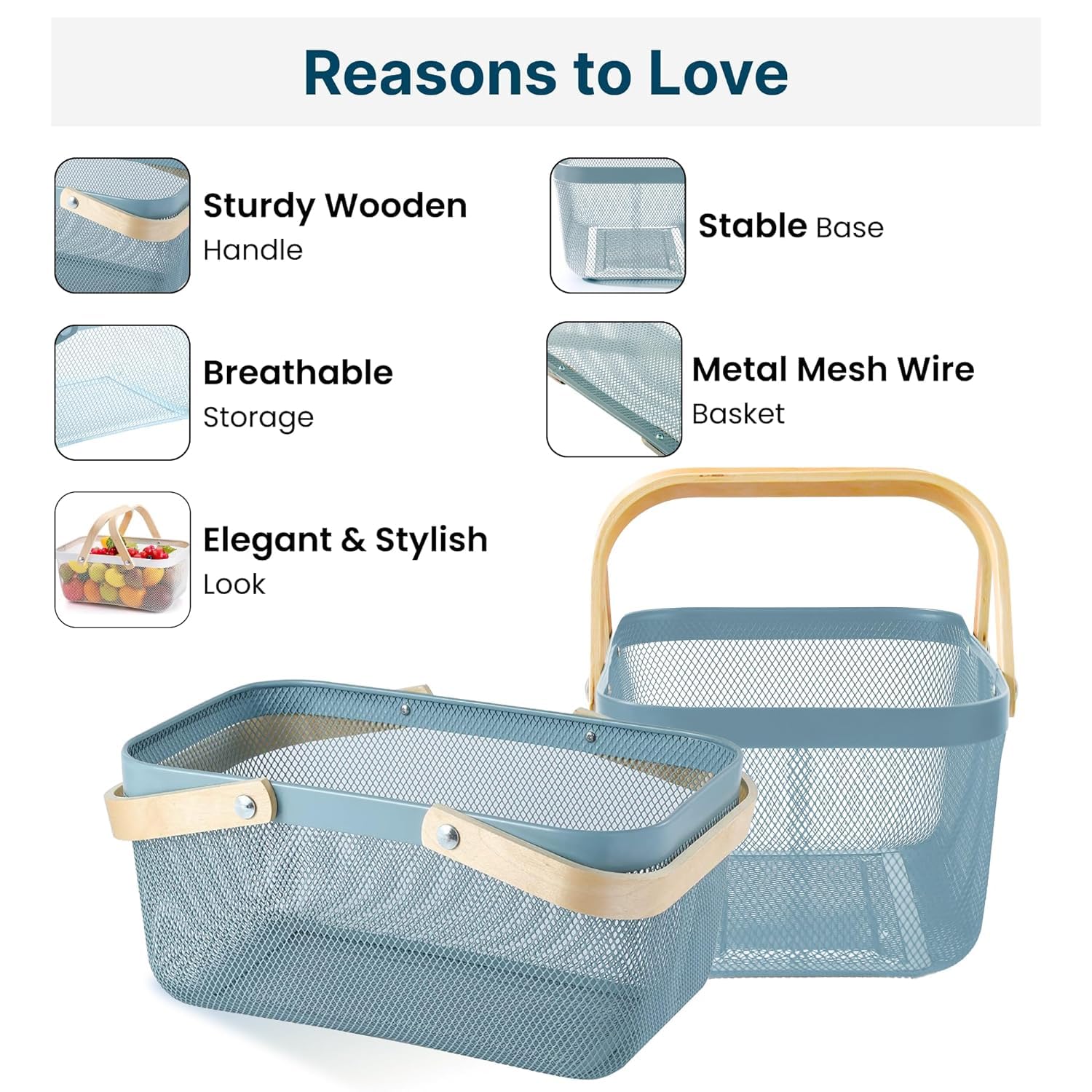 Introducing Kuber Industries 's versatile baskets for all your storage needs. These metal mesh wire baskets, with a beautiful blue color and wooden handle, are designed to provide maximum functionality while adding a touch of style to your home. The pack of 2 baskets offers a large capacity for all your storage requirements, making them perfect baskets for organizing home & also act as kitchen organizer, bathroom, bedroom, or office. The sturdy handle and stable base ensure the baskets can hold a variety of items without any hassle, while the anti-rust surface guarantees durability for long-term use. The fast drainage and breathable storage design of these baskets make them ideal for storing fruits, vegetables, toiletries, clothes, books, and more. The lightweight construction and wider space offer convenience and ease of use for everyday storage needs. Kuber Industries 's baskets are not only practical but also present a presentable option for organizing your household items. Customers appreciate the reliable brand reputation, good packaging, and the overall usefulness of these baskets. Whether you are a kid, mother, or daughter, these multipurpose baskets cater to all your storage requirements. From pantry organization to classroom storage, grocery shopping to picnic essentials, these baskets are the perfect solution for keeping your space clutter-free. With Kuber Industries 's Baskets for Storage, say goodbye to concerns about sturdiness, quality, or size. These baskets are designed to exceed customer expectations, providing a reliable and convenient storage solution for all your needs. Invest in these versatile baskets today and experience the convenience and satisfaction of organized living.Detailed Specifications: