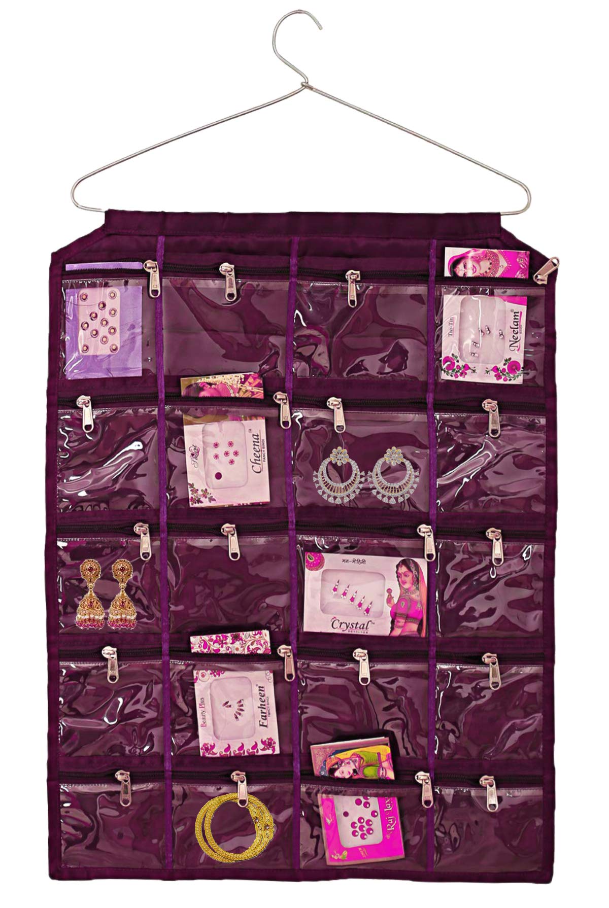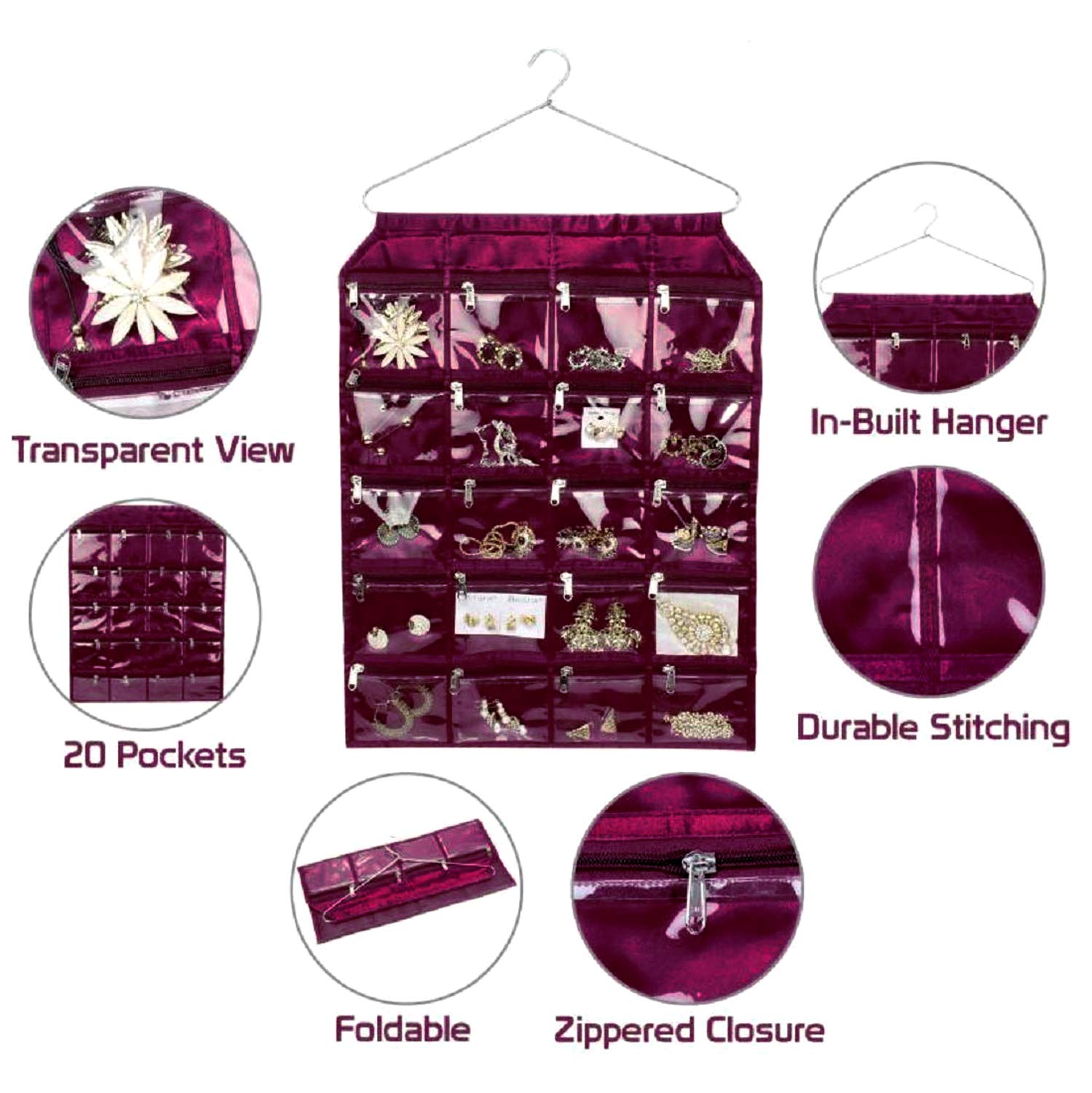 Material:Made of satin and clear PVC window. Organizer for Earrings,Pendants,Necklace,Bracelet, Ring, Watches,Chains,Pearl Jewellery,Accessory,Head rope,Headband or nail polish, cuffs, makeup brushes, Eye shadow etc. Transparent PVC window:easily view and protect items,endurable and good-looking,The hanging bag display Jewellery well and opening pockets for convenient to pick something to wear with an outfit, takes up just as much space as a Jacket hanging in the closet . Easy to Pick: No need to took the Jewellery out for selection; it's clear enough that you can easily look and guess through,The hanging bag With a hanger is convenient to put it anywhere, it can rolls up for easy carry, perfect for travel,Convenient to carry your Jewellery ! Comes with 20 Pocket: No need to put everything altogether and then scatter them throughout the room in the quest to find the little rings or earrings. You can put them in separate transparent pockets and select the one as they are visible.Kuber Industries is a customer-loved brand that brings you everything you need to make a house a home. Right from nifty storage solutions to smart kitchen essentials, our products are known for their premium and durable quality.