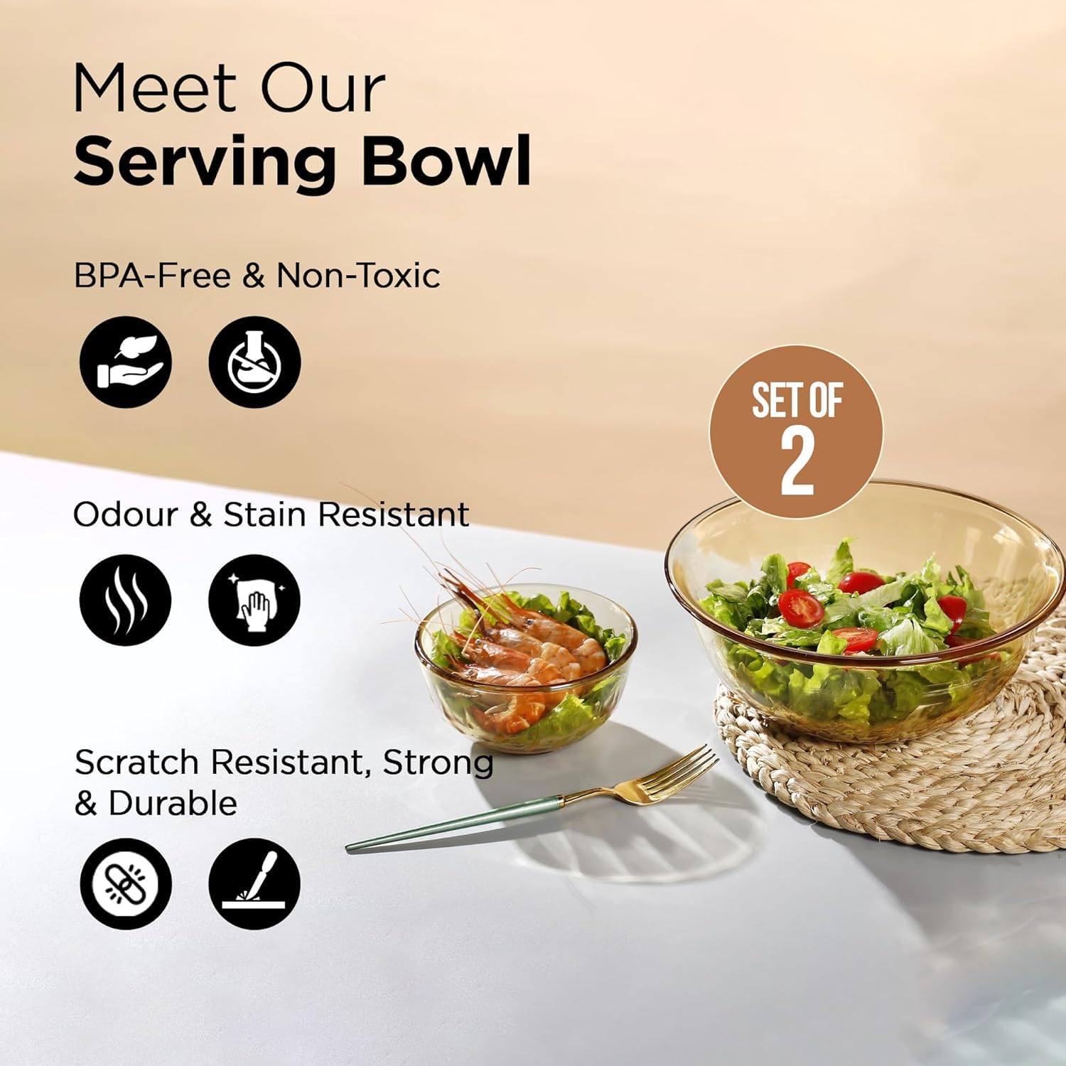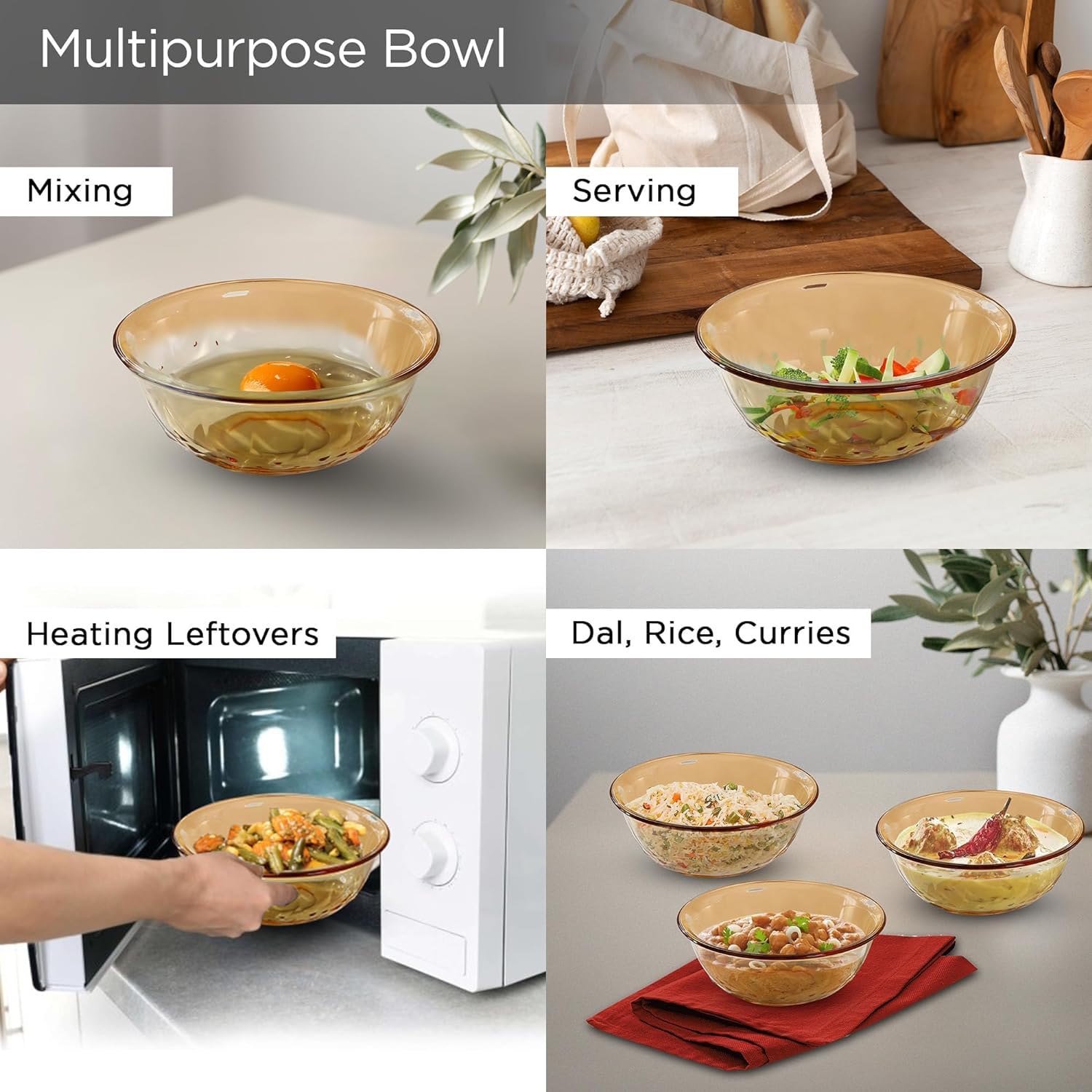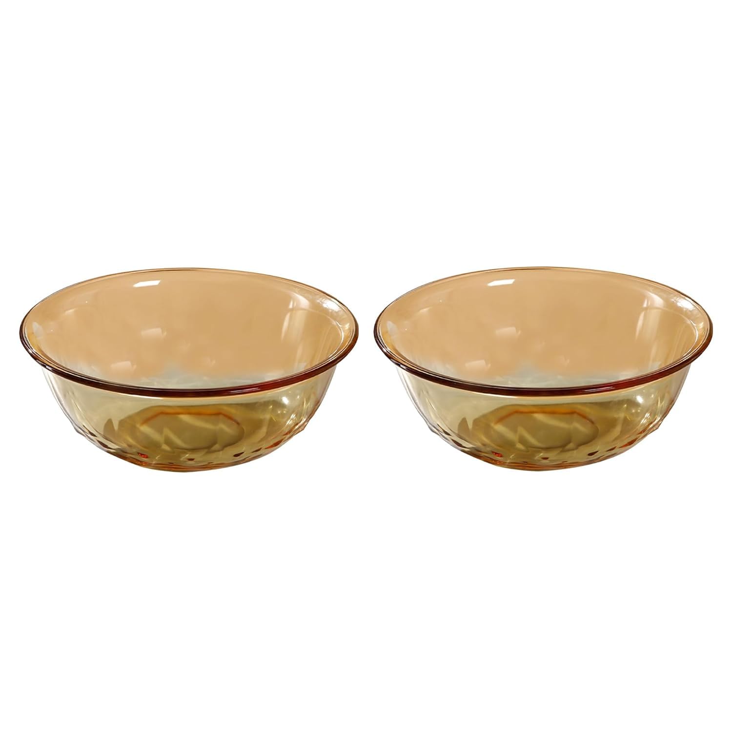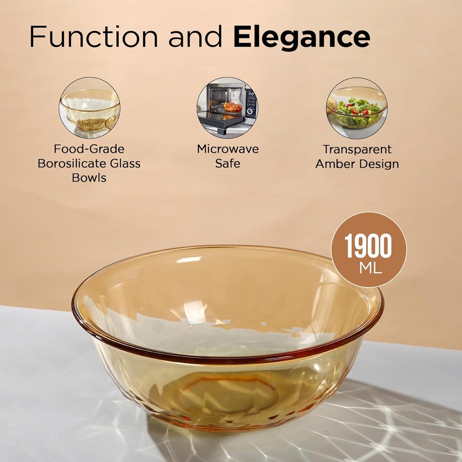 Introducing Kuber Industries 's premium Borosilicate Glass Bowls set, consisting of two 1900ml large capacity bowls in a beautiful transparent amber color. These bowls are perfect for serving, mixing, and everyday use in the kitchen. Made from scratch-resistant, odor-free, and non-porous glass, these bowls are strong, durable, and safe for use in the microwave and dishwasher. Kuber Industries 's Borosilicate Glass Bowls are designed to meet the highest quality standards, providing a healthier option for your kitchen needs. The non-toxic and BPA-free material ensures that no harmful chemicals leach into your food. The versatile usage of these bowls makes them a great value for money, offering both functionality and aesthetics. Whether you are serving snacks to guests or preparing meals for your family, these bowls cater to all your needs. The set of two bowls comes in a modern round shape, with a glossy finish that adds a touch of elegance to your dining table. Customers love the good quality and perfect size of these bowls, making them a preferred choice for daily use. Kuber Industries understands the importance of customer satisfaction and aims to provide high-quality products that meet or exceed expectations. By offering large capacity, scratch-resistant, and microwave-safe bowls, Kuber Industries ensures that customers get great size, value, and durability in one package. The Borosilicate Glass Bowls set is the perfect addition to any kitchen, delivering on both functionality and style. With Kuber Industries 's Borosilicate Glass Bowls, say goodbye to size issues, poor quality, and difficult-to-use kitchenware. These bowls are designed to make your cooking experience hassle-free and enjoyable, meeting the expectations of value-conscious customers who seek high-quality, reliable products. Upgrade your kitchen with Kuber Industries 's premium bowls and elevate your dining experience.Detailed Specifications: