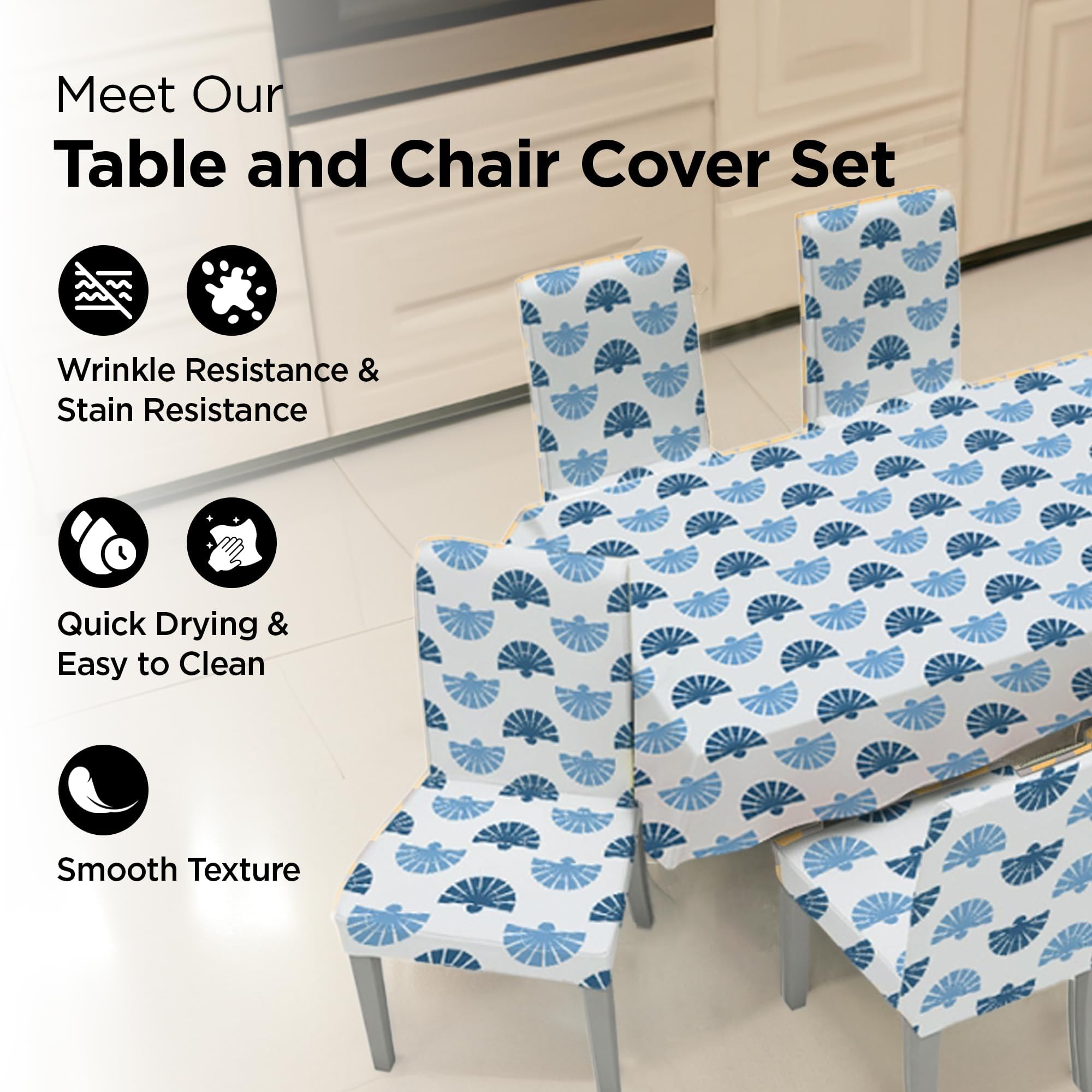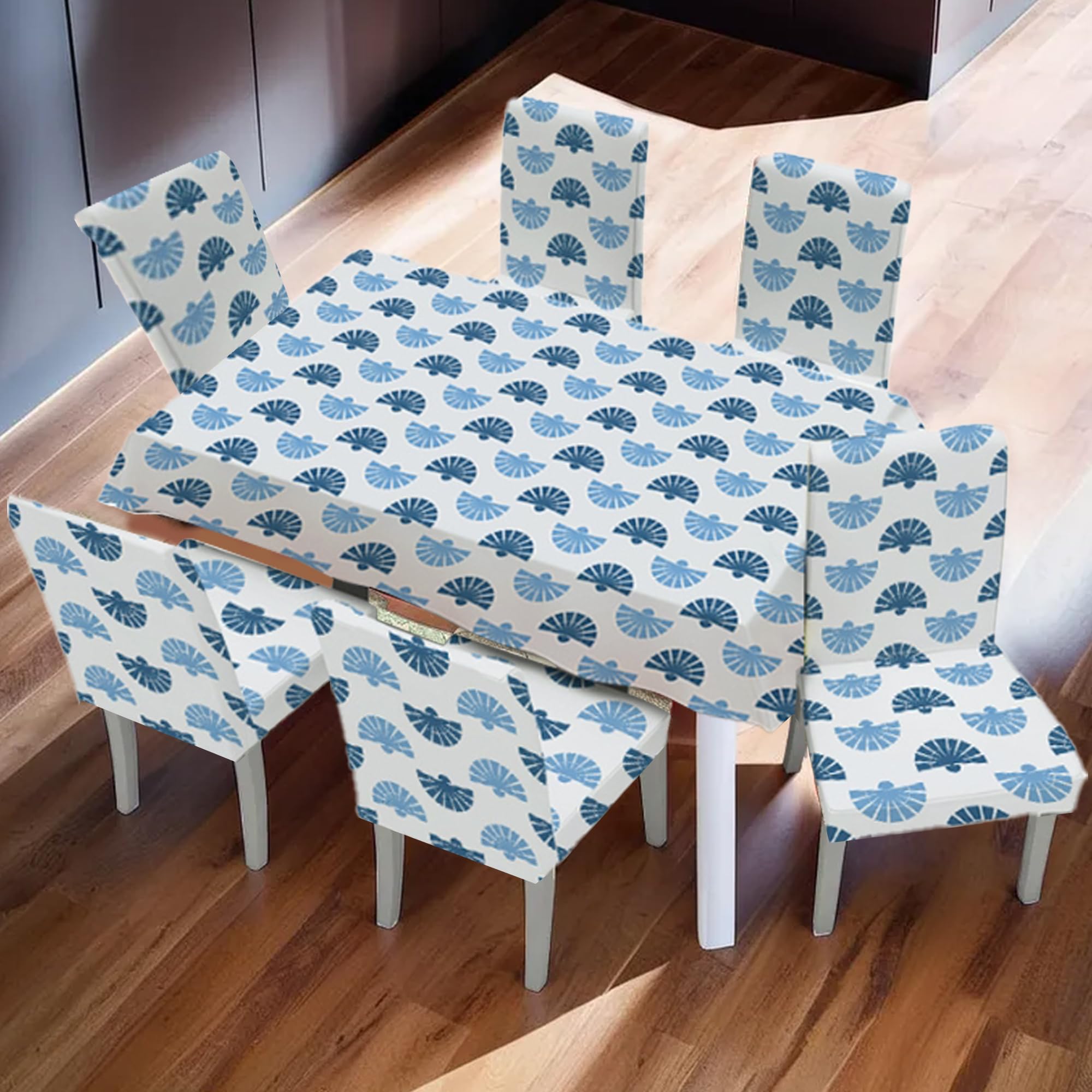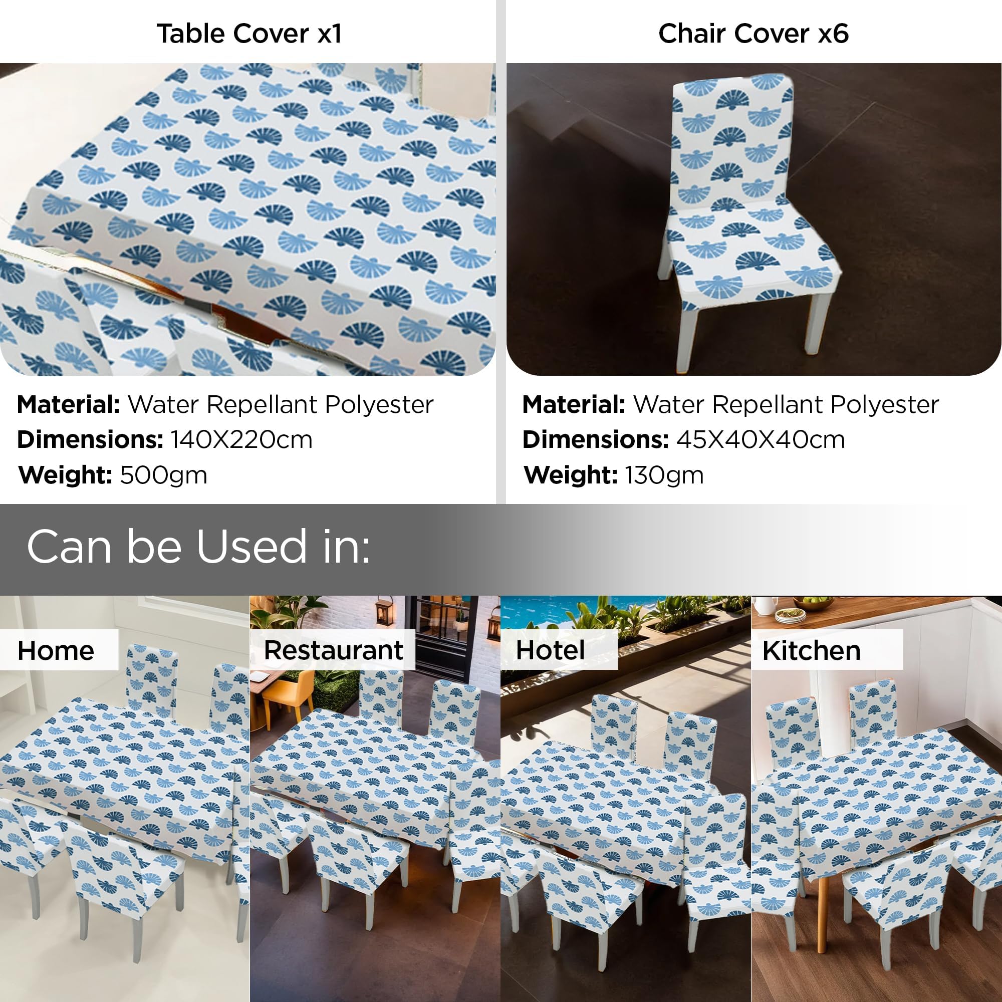 Kuber Industries Set of 7 Waterproof & Oil Repellent Dining Table Chair Cover 6 Seater Full Set | Washable & Dustproof Table & Seat Cover Protector Slipcover | Floral Leaf Pattern Blue