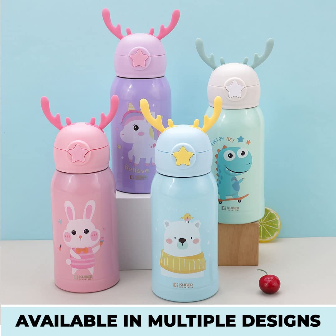Kuber Industries Brings you a range of multi utility items for your kitchen. The Kuber stainless steel water bottle for kids with a cover is a premium quality, stylish and practical sipper bottle for kids to carry to school, picnics or trips. Not only will your child fall in love with the bunny design, but also enjoy each sip he takes from it. The steel sipper bottle for kids is made with high quality stainless steel, comes with a straw, sipper lid, cup and a fabric bag with a thick strap making it easier to carry. The sipper bottle for kids is also BPA Free. The airtight lid of this kids water bottle for girls and boys makes it leak proof, ensuring your child can carry the water around without spilling on clothes or books. Made of double 316 SS, this steel bottle for kids is the perfect choice for children of all age groups. It also makes for a perfect gifting option for school going kids. The wide mouth of this water bottle makes it easy to clean and thus keeps germs and bacterial infections away.Kuber brings you a range of multi-utility items for your kitchen. The Kuber water bottle for kids with a sipper is a premium quality, stylish, and practical sipper bottle for kids to carry to school, picnics, or trips. Not only will your child fall in love with the cute design, but also enjoy each sip he takes from it. The sipper bottle for kids is made with high-quality food-grade plastic and comes with a straw, and sipper lid making it easier to drink from. The airtight lid of this kid's water bottle for girls and boys makes it leakproof, ensuring your child can carry the water around without spilling on clothes or books. This plastic bottle for kids is the perfect choice for children of all age groups. It also makes for a perfect gifting option for school-going kids. The wide mouth of this water bottle makes it easy to clean and thus keeps germs and bacterial infections away