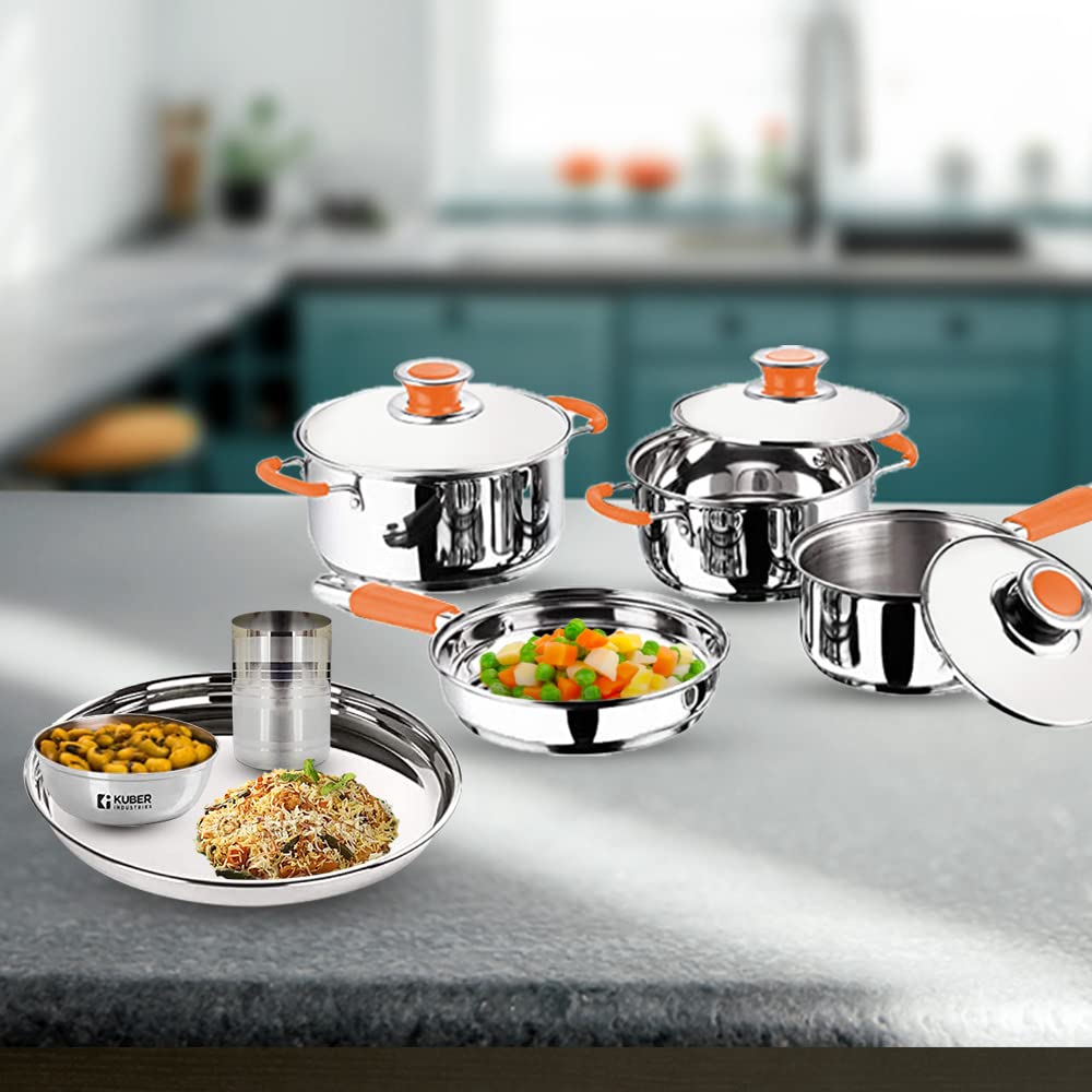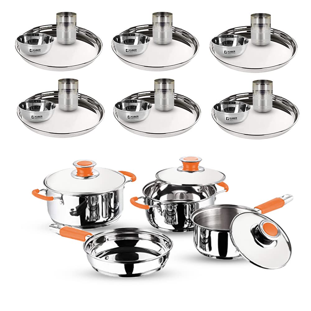 Kuber Industries brings you a range of high-quality stainless steel cookware set, plates, glasses, and bowls. This set is made of high-quality steel, ensuring durability and easy cleaning. The set comprises of 6pcs of plates, 6pcs of glasses, 6pcs of bowls, saucepan, Kadai, casserole, and frypan all with lids for home, both with a glossy finish and wobble-free bases, suitable for gas stove and induction cooking. This highly versatile and elegant stainless steel cookware is available with induction and gas stove base, making it the perfect choice for any home kitchen. | | |