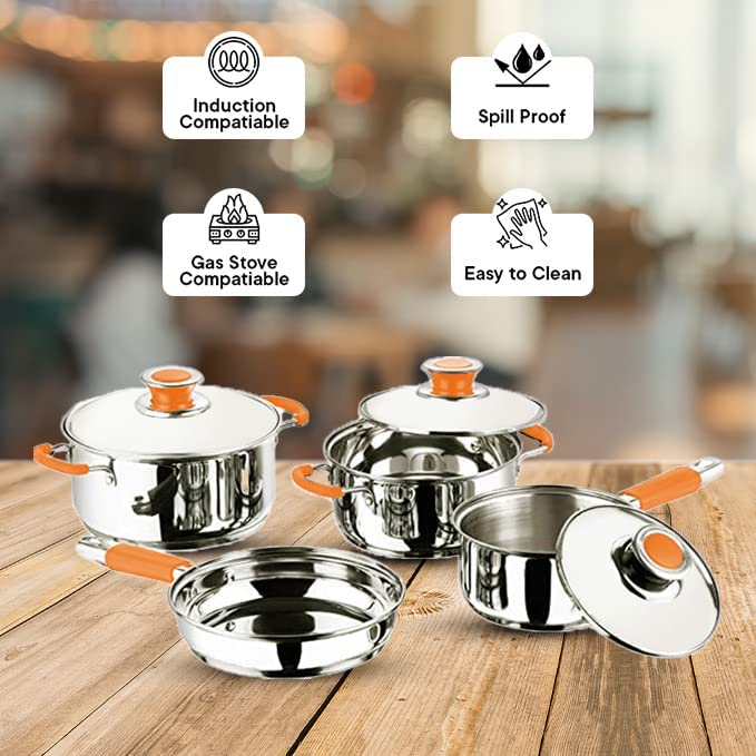 Professionally ManufacturedThe handles of the cookware are securely attached using rivets, providing added strength. The cookware is made of 18/18, 22-Gauge stainless steel with a strong bond between the metals. This construction allows heat to evenly distribute throughout the entire cookware, including the sides, for optimal cooking results. | Induction friendlyIt is designed to work with both gas stoves and induction cooktops, making it versatile and easy to use for any type of stove. | Stylish & DurableOptimum capacity making it easier to measure and cook your favorite dish in the right amount. In addition to its functionality in the kitchen, stainless steel cookware also has a sleek and modern look that makes it a great choice for cooking and dining. |