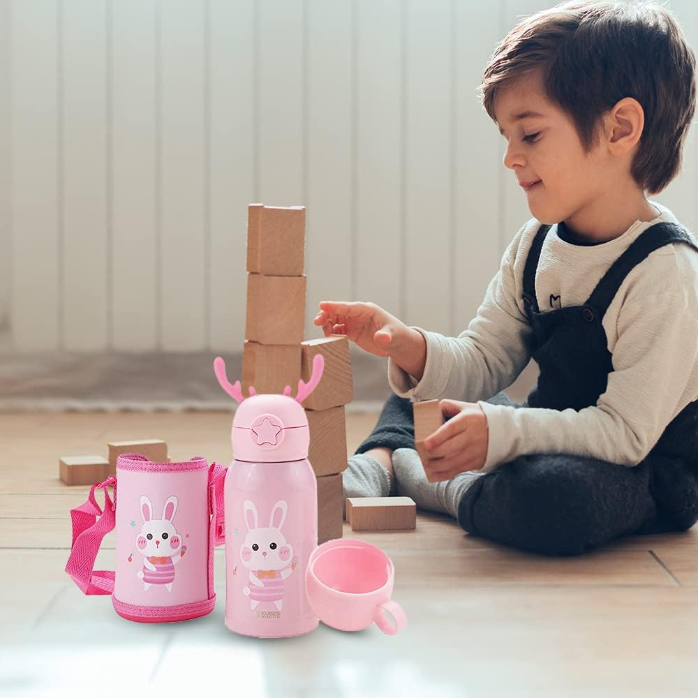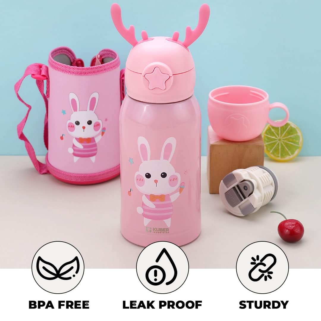 Kuber Industries Brings you a range of multi utility items for your kitchen. The Kuber Industries stainless steel water bottle for kids with a cover is a premium quality, stylish and practical sipper bottle for kids to carry to school, picnics or trips. Not only will your child fall in love with the bunny design, but also enjoy each sip he takes from it. The steel sipper bottle for kids is made with high quality stainless steel, comes with a straw, sipper lid, cup and a fabric bag with a thick strap making it easier to carry. The sipper bottle for kids is also BPA Free. The airtight lid of this kids water bottle for girls and boys makes it leak proof, ensuring your child can carry the water around without spilling on clothes or books. Made of double 316 SS, this steel bottle for kids is the perfect choice for children of all age groups. It also makes for a perfect gifting option for school going kids. The wide mouth of this water bottle makes it easy to clean and thus keeps germs and bacterial infections away.Detailed Specifications: