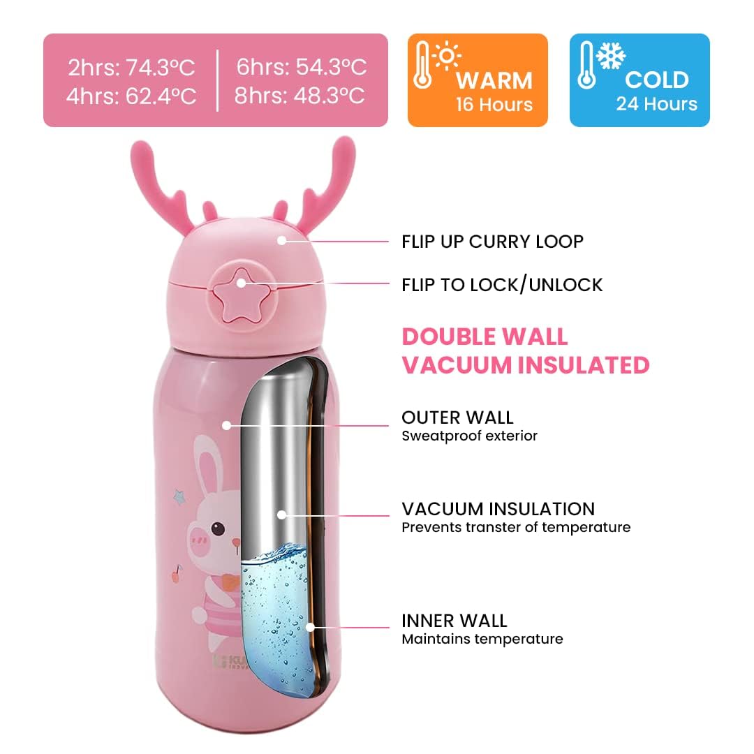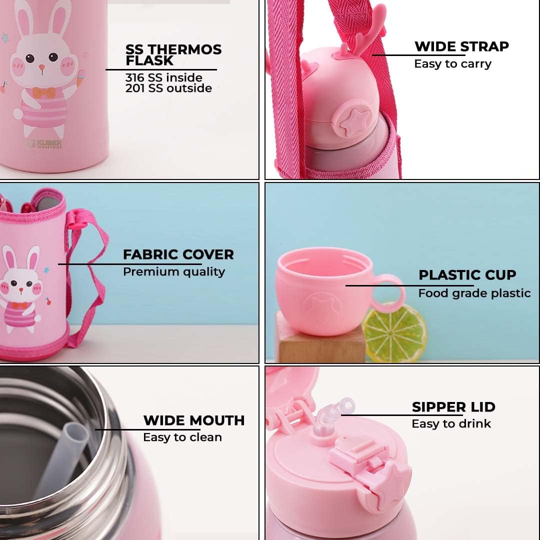 Kuber Industries Brings you a range of multi utility items for your kitchen. The Kuber Industries stainless steel water bottle for kids with a cover is a premium quality, stylish and practical sipper bottle for kids to carry to school, picnics or trips. Not only will your child fall in love with the bunny design, but also enjoy each sip he takes from it. The steel sipper bottle for kids is made with high quality stainless steel, comes with a straw, sipper lid, cup and a fabric bag with a thick strap making it easier to carry. The sipper bottle for kids is also BPA Free. The airtight lid of this kids water bottle for girls and boys makes it leak proof, ensuring your child can carry the water around without spilling on clothes or books. Made of double 316 SS, this steel bottle for kids is the perfect choice for children of all age groups. It also makes for a perfect gifting option for school going kids. The wide mouth of this water bottle makes it easy to clean and thus keeps germs and bacterial infections away.Detailed Specifications: