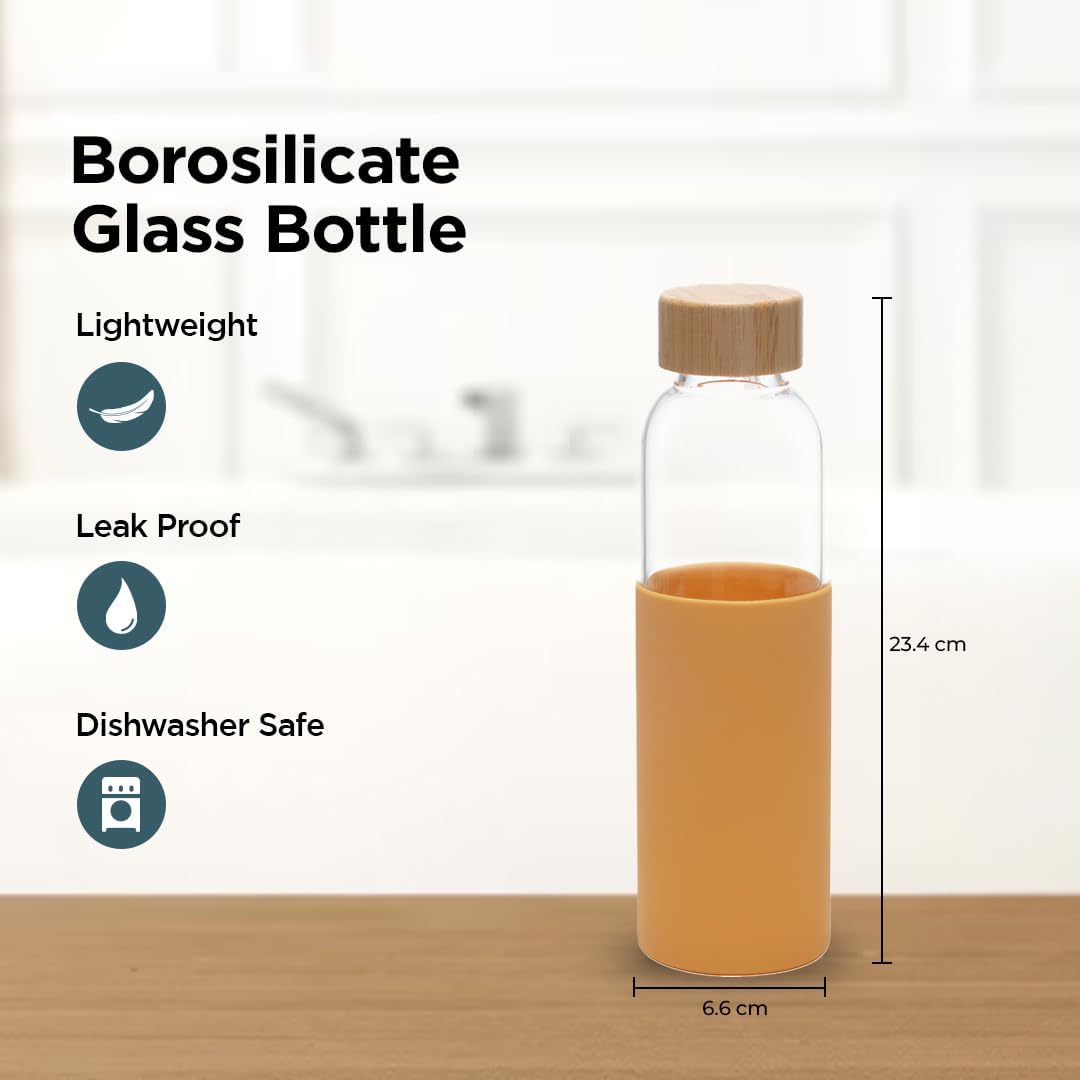 Homestic Glass Bottle with Silicone Sleeve and Bamboo Lid offers durability and functionality. Its thermal resistance maintains beverage temperatures, while the silicone sleeve ensures a secure grip and impact protection. The leak-proof bamboo lid makes it ideal for daily use, travel, or workouts. Easy-to-clean and dishwasher-safe, it supports a reusable and eco-conscious lifestyle. This bottle fulfills the need for a durable, versatile, and eco-friendly hydration solution. With an easy-to-clean design and dishwasher compatibility, it advocates a reusable and eco-conscious lifestyle.Detailed Specifications: