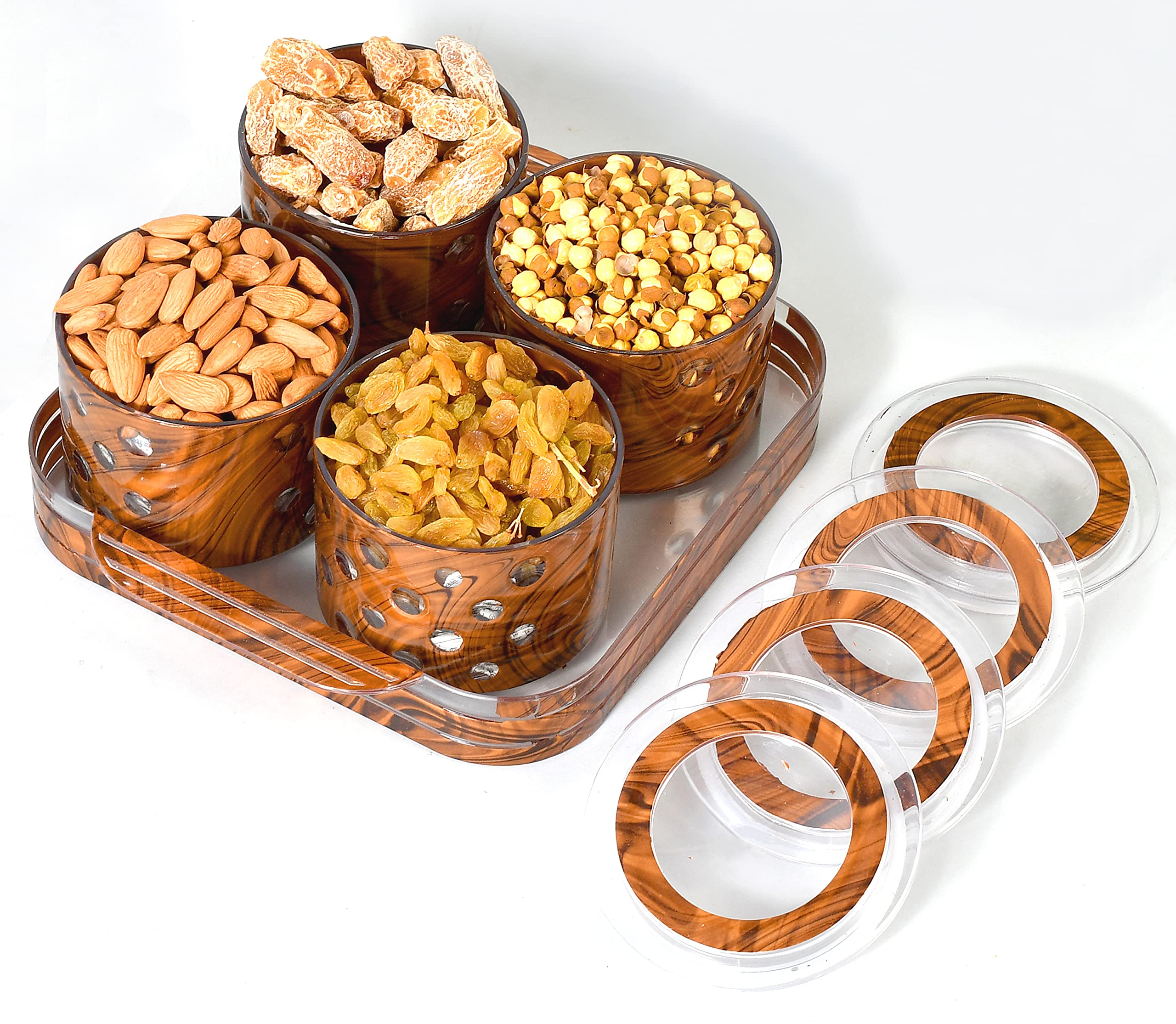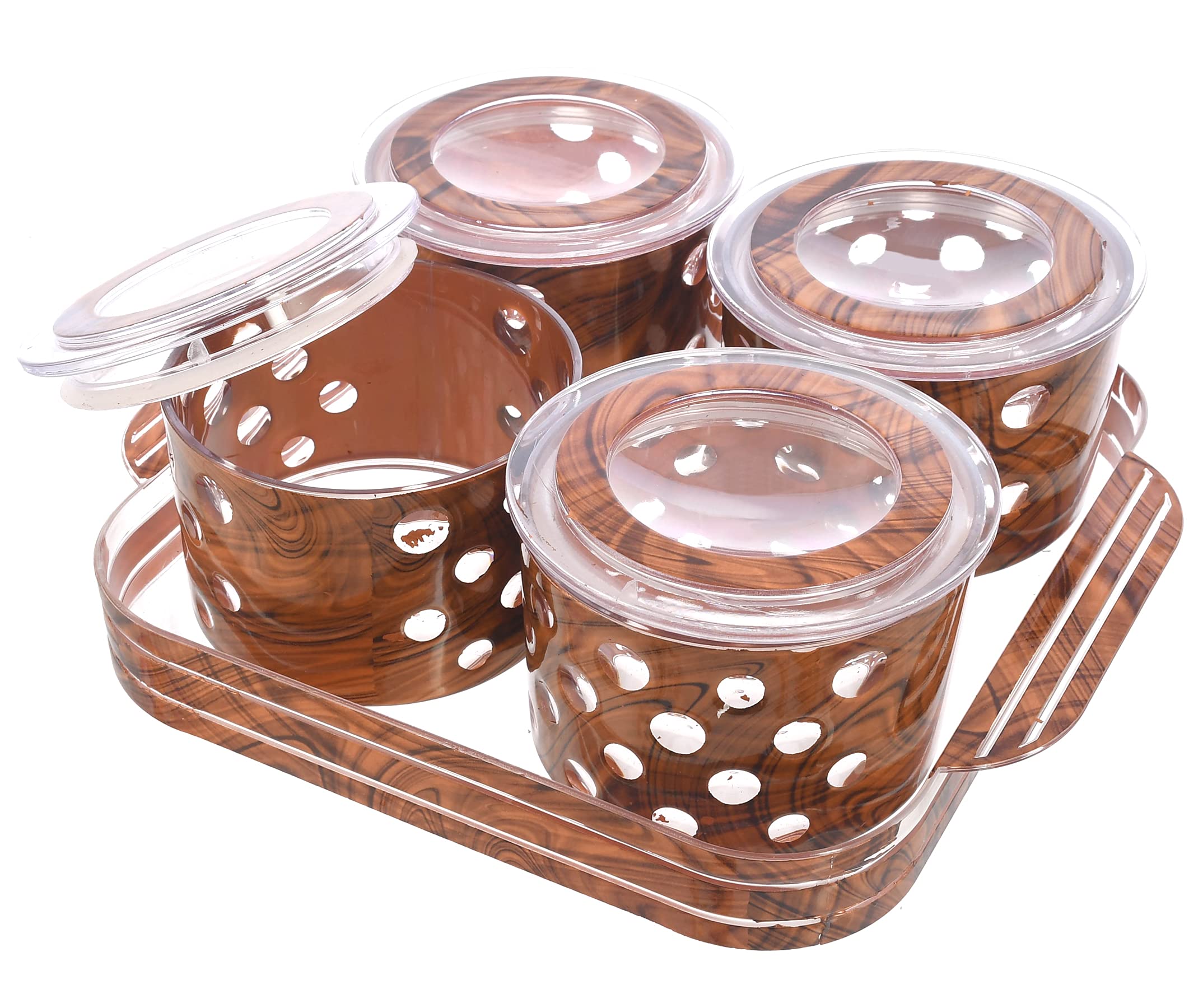 Kuber Industries multipurpose set of 4 airtight food storage containers with lids and a serving tray. Having a tea with crispy bites of biscuits or namkeen is something you love to do daily - be it a morning starter or evening snack. Airtight Storage Containers with tray in multi design is perfect for storing essential food ingredients such as Biscuits, Dry Fruits, Cookies, Candies, Nuts, Snacks, chocolates and many more. This Stylish and versatile container is made from 100 percent Food Grade plastic BPA Free and offers great durability. Best for your kitchen this Air tight container will keep the contents fresh for a long time. Ideal Usage is for keeping daily snacks to serve guests and for gifting purpose.Detailed Specifications: