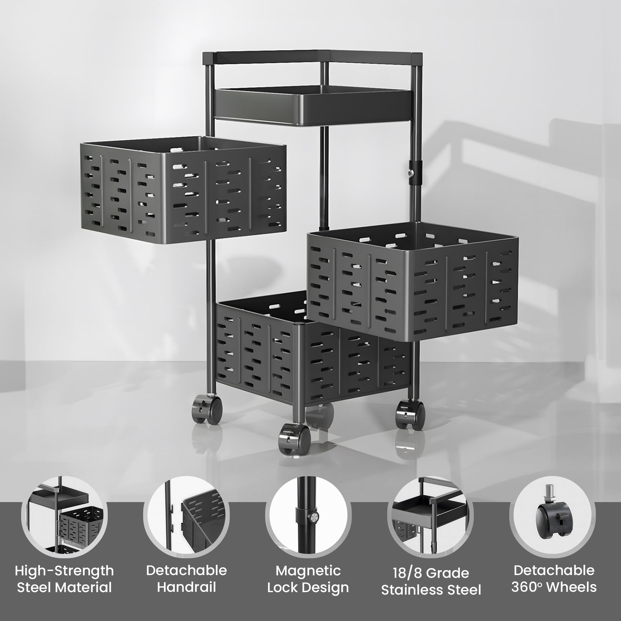 Introducing the UMAI 4-Layer Mesh Kitchen Rack for Storage with Rotating Baskets. Crafted from durable carbon steel powder coating, this rack offers anti-corrosion, anti-skid and rust-resistant properties. The unique rotating place orchid design with 4-layer square plate crystal baskets adds elegance to your kitchen decor. The 360° brake universal wheels provide easy mobility and stability, while the 4 moving pulleys ensure smooth maneuverability. Installation is simple with the included free installation book. The lock design with magnetic closure ensures safety and security for your items. The breathable baskets with encrypted wire mesh keep your fruits and vegetables fresh, and the space-saving design optimizes kitchen storage. The pull-out rotation feature allows for easy access and neat storage. Cleaning is a breeze with a simple wipe using a wet towel. Experience the convenience and efficiency of the UMAI 4-Layer Mesh Kitchen Rack. Elevate your kitchen organization and streamline your cooking routine with this durable and versatile storage solution.