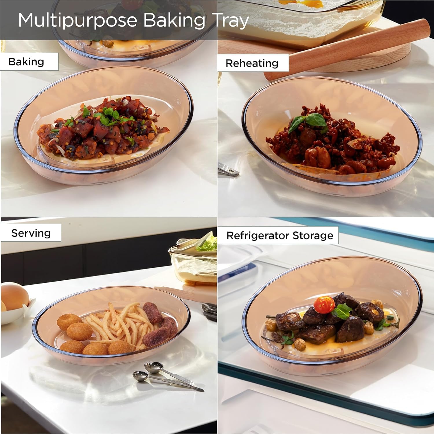 Introducing the Homestic Borosilicate Glass Baking Tray, a versatile addition to your kitchen essentials. This transparent baking tray is perfect for all your baking needs, from cookies to cakes, pastries, and bread. The oval shape and 2400 ml capacity make it ideal for baking delicious bread loaves and mouth-watering puddings. Crafted from high-quality borosilicate glass, this baking tray is microwave, oven, freezer, and dishwasher safe, offering convenience and ease of use. The non-porous and odour-free material ensures that your food stays fresh and flavourful with each use. Customers love the Homestic Glass Baking Tray for its multipurpose functionality. Use it for baking, serving, storing in the refrigerator, mixing ingredients, marinating, freezing, grilling, and more. Whether you're roasting meats, vegetables, or reheating leftovers, this baking tray is a must-have in every kitchen. For those looking for safe and healthy bakeware options, Homestic delivers with this BPA-free and non-toxic glass dish. Easy to clean and maintain, this baking tray ticks all the boxes for a reliable and durable kitchen essential. Ideal for home cooks, bakers, food enthusiasts, and anyone who enjoys preparing delicious meals with ease. Whether you're baking, serving, or storing food, the Homestic Glass Baking Tray is a versatile and practical choice. Upgrade your kitchen bakeware with the Homestic Borosilicate Glass Baking Tray and enjoy the convenience of a high-quality, durable, and multipurpose baking dish that meets all your culinary needs.Detailed Specifications: