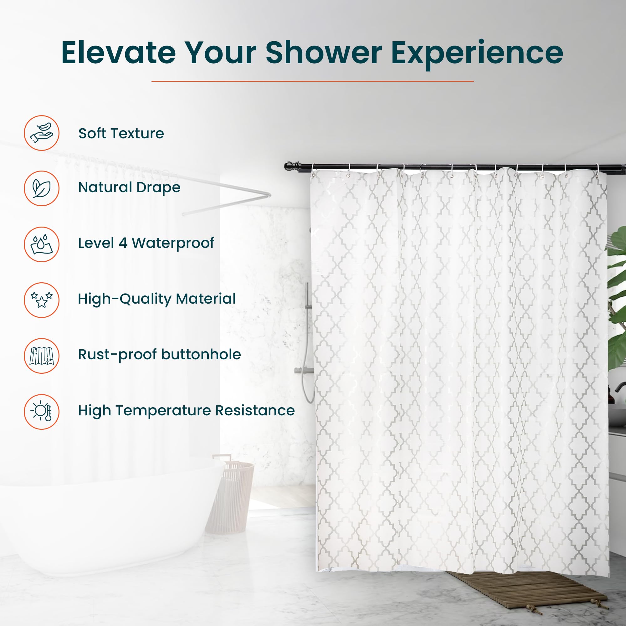 Homestic Bath Curtain is a must-have addition to your bathroom. Crafted with excellent material and a soft texture, it offers a natural drape that enhances your bathroom decor. With its rust-proof button holes, it ensures durability and ease of use. Made from PEVA material, it boasts high temperature resistance and is level 4 waterproof, providing optimal protection against water splashes and spills.Detailed Specifications: